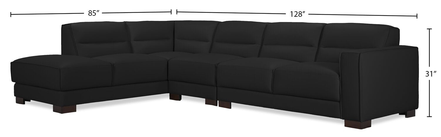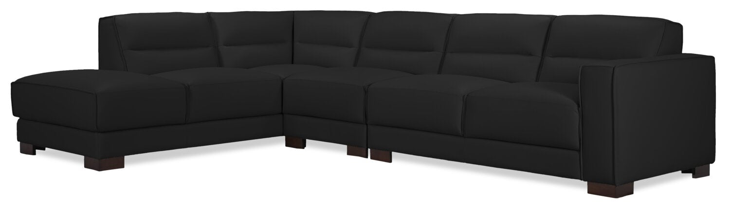 Perfectly suited for luxury spaces, this Citadel sectional exudes modern elegance. Wrapped in sleek genuine leather, this piece will effortlessly elevate any surrounding setting. A rich black hue makes it an ideal addition to various homes, complementing neutral tones and bold colours. Plus, dark brown legs complement the dark upholstery to add subtle style. Although this sectional boasts a sophisticated design, it is also notable for its comfort. Lean into high-density foam cushions and revel in the lavish feel of smooth leather. Make a grand statement with the Citadel.