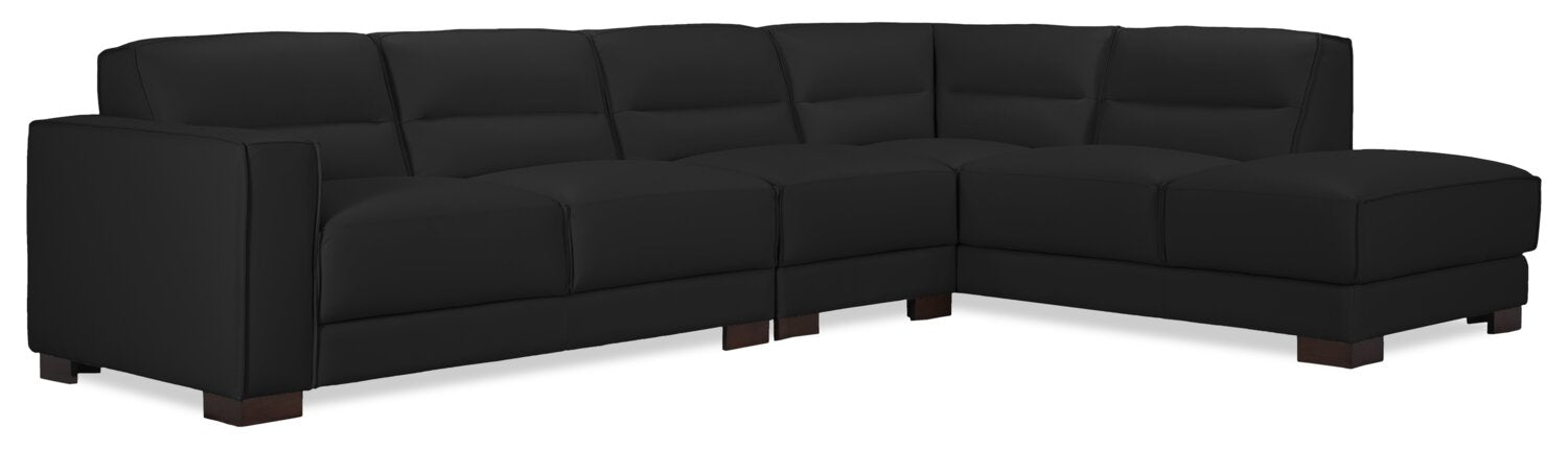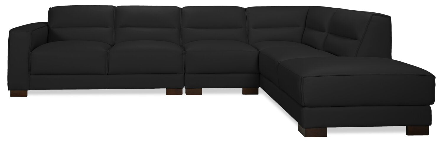 Perfectly suited for luxury spaces, this Citadel sectional exudes modern elegance. Wrapped in sleek genuine leather, this piece will effortlessly elevate any surrounding setting. A rich black hue makes it an ideal addition to various homes, complementing neutral tones and bold colours. Plus, dark brown legs complement the dark upholstery to add subtle style. Although this sectional boasts a sophisticated design, it is also notable for its comfort. Lean into high-density foam cushions and revel in the lavish feel of smooth leather. Make a grand statement with the Citadel.