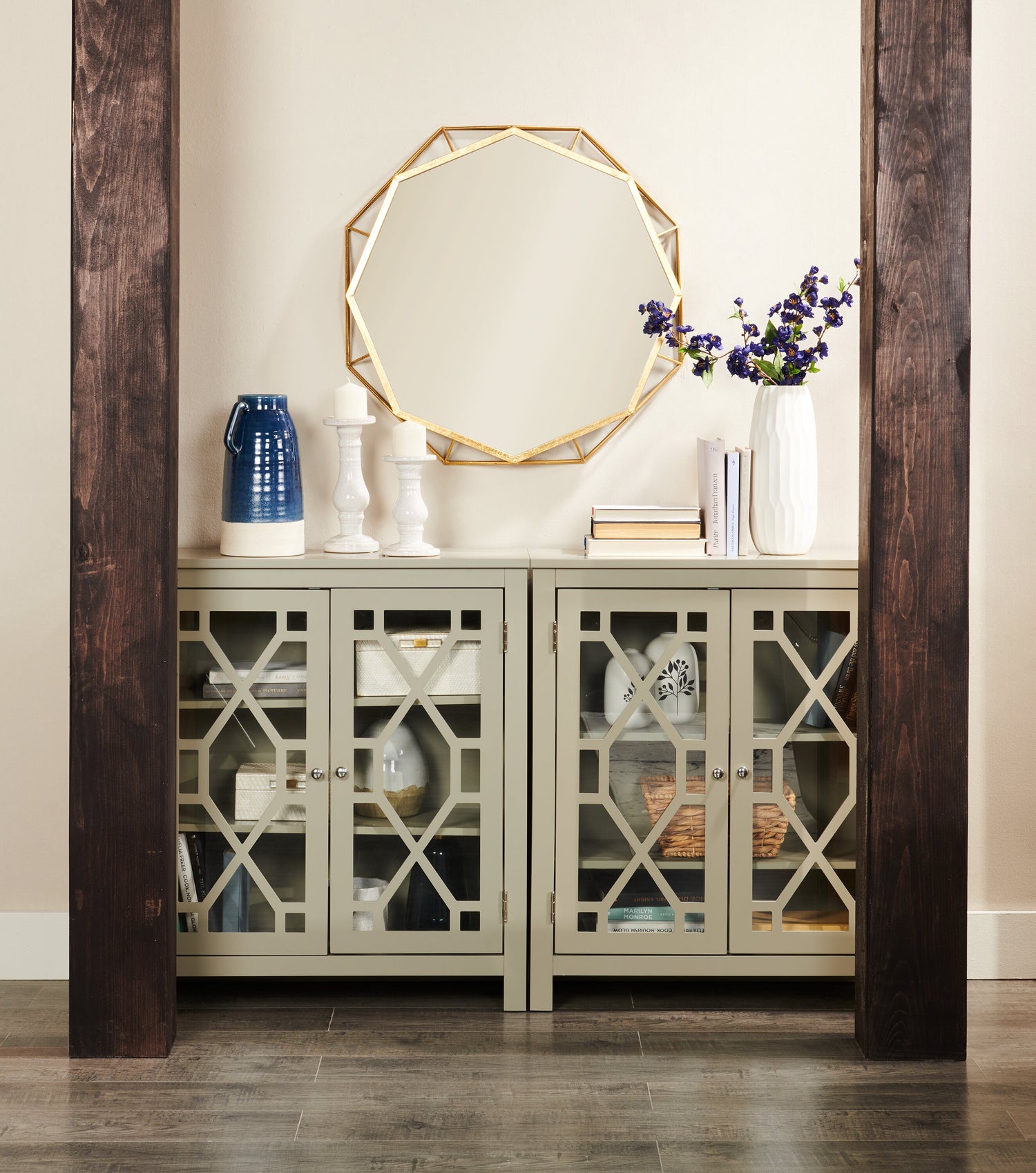 | Hardware | Two metal handles on the cabinet doors add a glint of sparkle. |