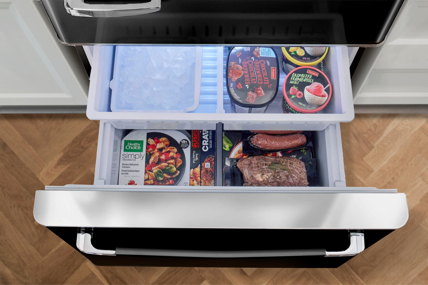 The 18 cu. ft. Classic Retro bottom mount refrigerator is the perfect family-sized refrigerator with ample space to keep all your fresh and frozen foods, packaged in an eye-catching throwback design. This refrigerator is ENERGY STAR Certified for energy efficiency all year-round, designed for optimal energy savings and easy, dependable use. An intuitive control panel enables precise temperature control while providing intelligent features like Quick Cool and Quick Freezer. Its frost-free design allows for easy cleaning without dealing with frost buildup and It also comes with a built-in ice maker and a spacious freezer compartment for all your family’s needs.