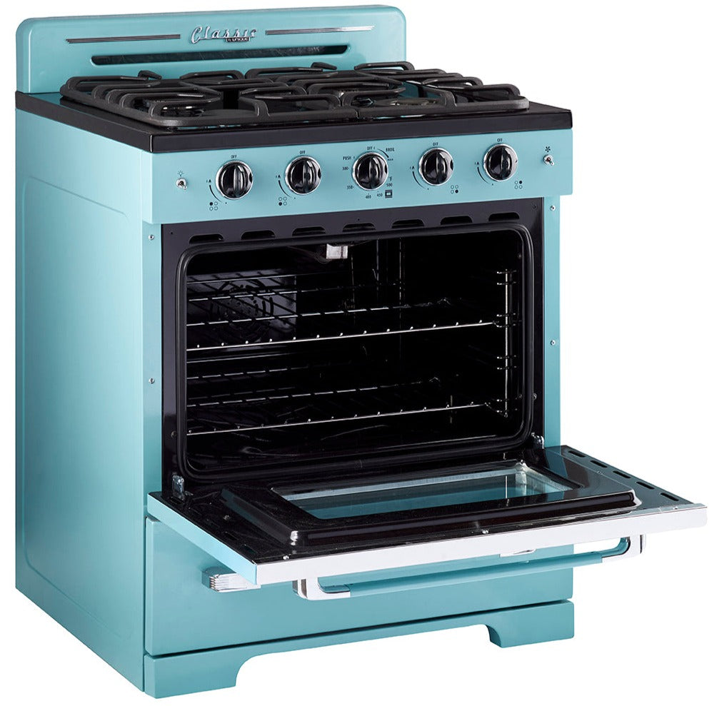 With its iconic retro look and throwback chrome accents, this 30” Classic Retro stove is the perfect addition to any kitchen design that harkens back to the '50s. Along with classic good looks, this stove also features the convenience of convection cooking, which circulates heat for incredibly even distribution to speed up cooking time. Plus, a waist-high broiler allows you the option of intense searing at a height that’s comfortable. The simple, effortless controls are easy to use, quick to keep clean and add an extra retro touch.