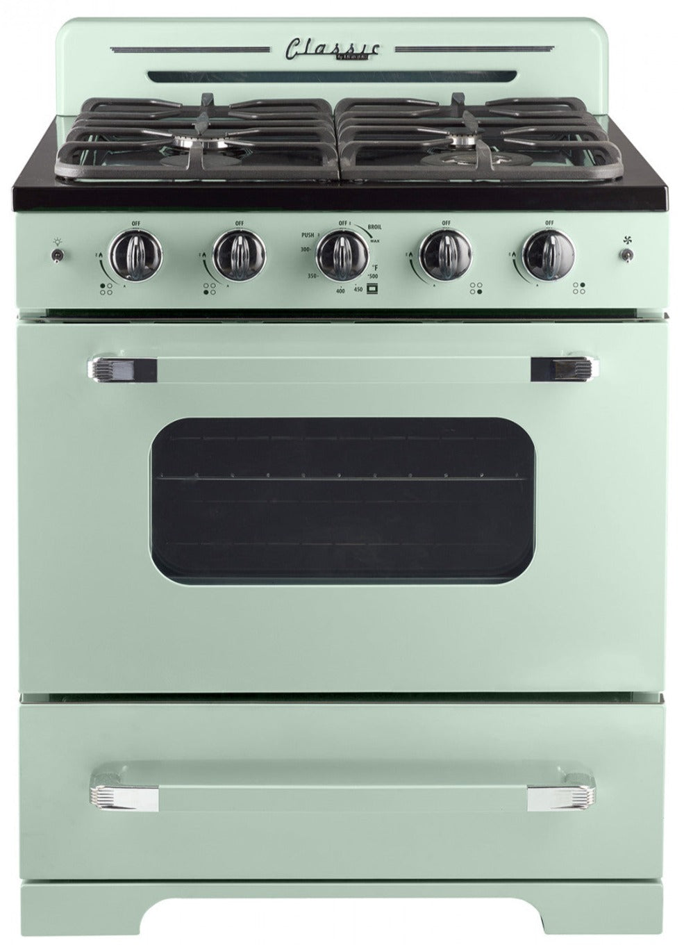 With its iconic retro look and throwback chrome accents, this 30” Classic Retro stove is the perfect addition to any kitchen design that harkens back to the '50s. Along with classic good looks, this stove also features the convenience of convection cooking, which circulates heat for incredibly even distribution to speed up cooking time. Plus, a waist-high broiler allows you the option of intense searing at a height that’s comfortable. The simple, effortless controls are easy to use, quick to keep clean and add an extra retro touch.