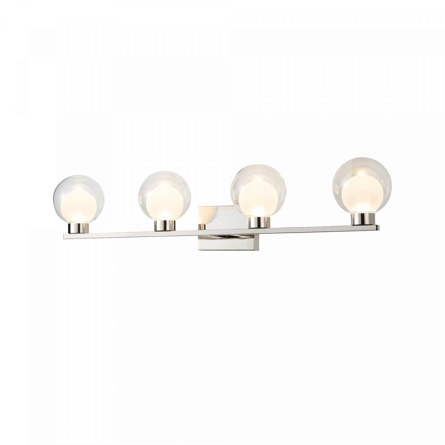 The colton collection 4 lite bathroom vanity exudes contemporary elegance with its polished nickel frame, radiating refined charm. Its double glass design—clear outer and frosted inner—creates a mesmerizing glow, enhanced by energy-efficient led illumination. Tailored to your ambiance, a convenient 3cct switch allows you to choose between warm (3k), neutral (4k), or cool (5k) color temperatures. Perfect for modern interiors, this fixture blends practicality and artistry effortlessly. Great for a bathroom or vanity.