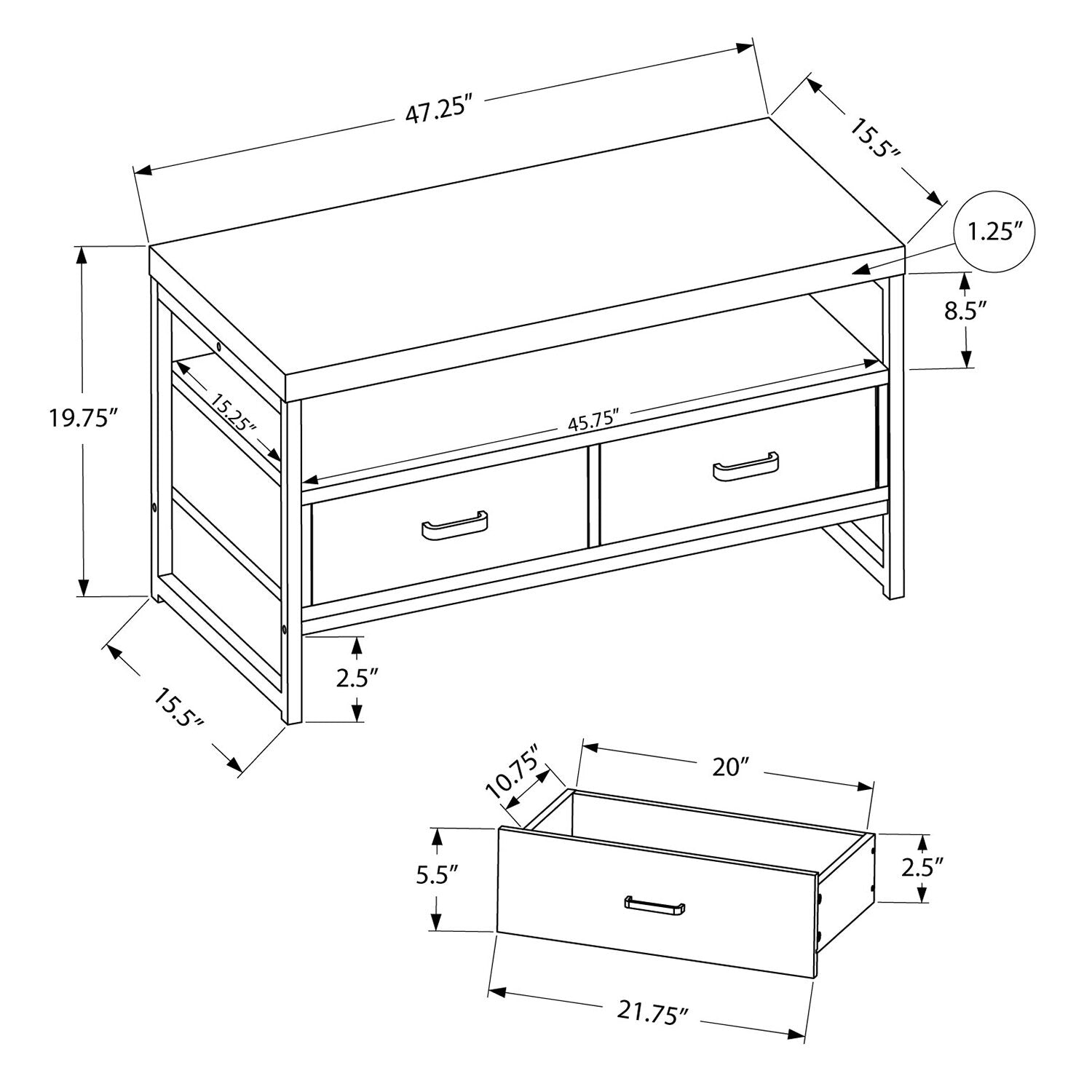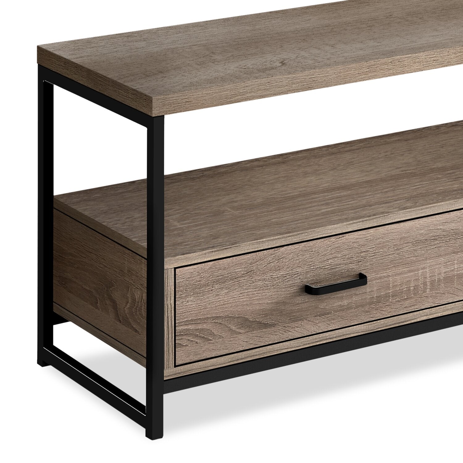 Enjoy the two-tier spaciousness of this Corban TV stand. The roomy stand top with thick-panel construction accommodates most TVs up to 55 inches. Below, the open-concept shelf provides ample room for audio-visual components and easy cable management, while the two drawers can store remotes, game controllers or entertainment accessories. This piece is supported by a sleek black metal frame that provides a modern look. With its space-saving design, this media console is a great choice for an apartment, condo or small home.