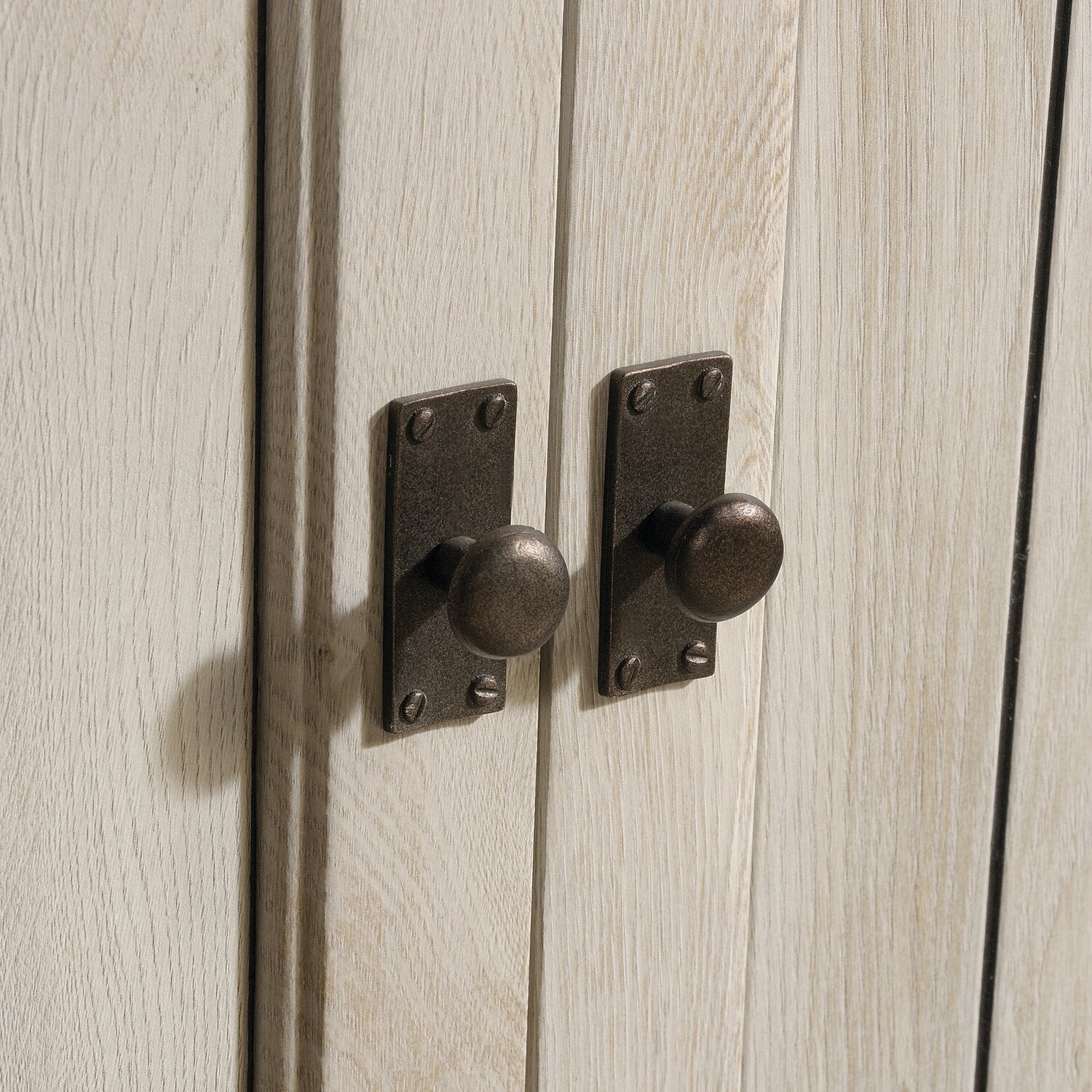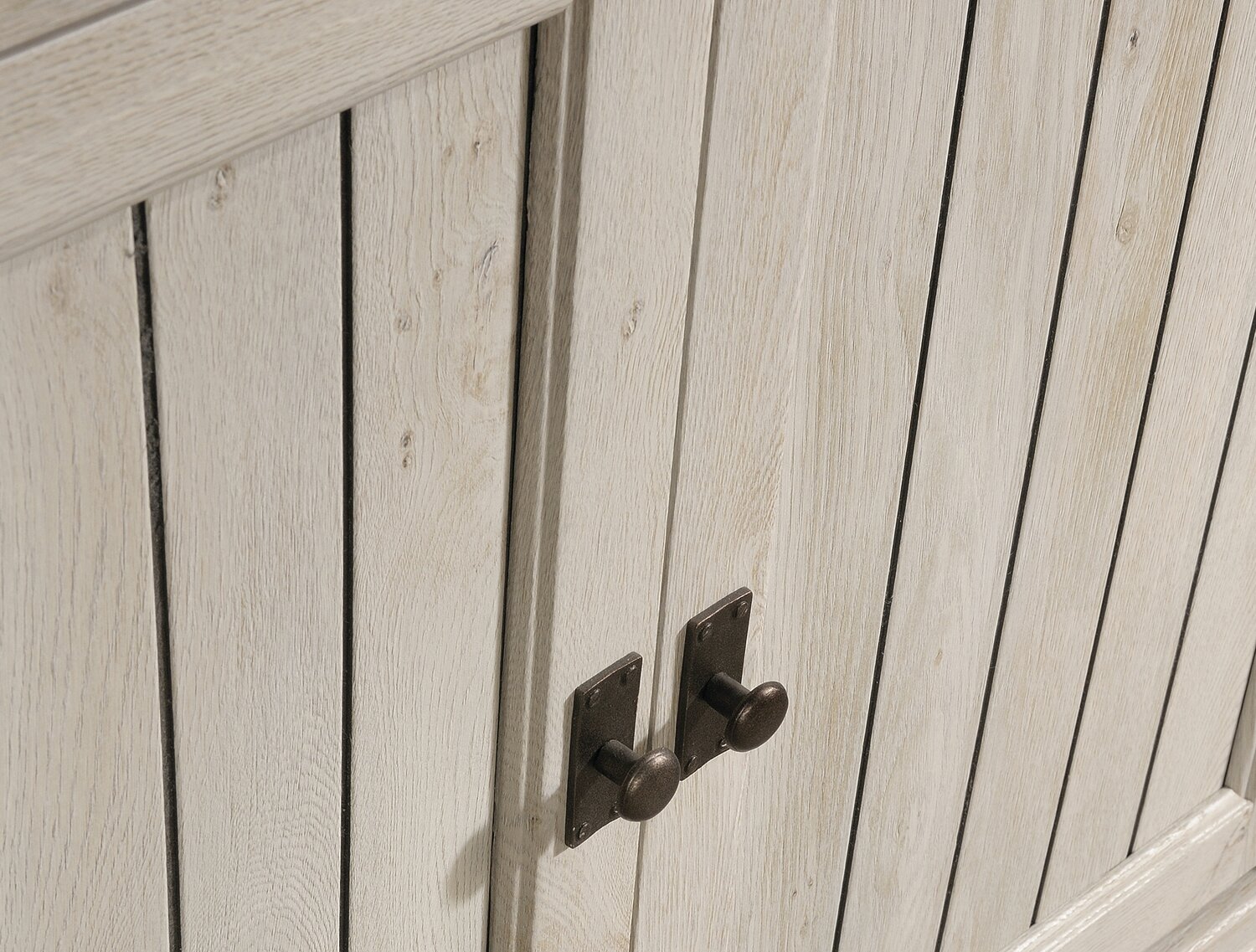 | Hardware | Frame and panel doors feature slat-front detailing. |