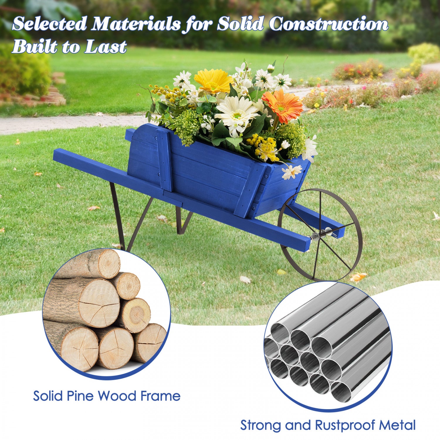 | Additional Information | Color: Blue Material: Pine Wood, Metal Overall Dimensions: 27.5" x 10.5" x 11.5" (L x W x H) Diameter of the Wheel: 7.5" Weight Capacity: 11 lbs Net Weight: 2.5 lbs Package Included: 1 x Wooden Wagon Planter 9 x Magnetic Accessory 1 x User's Manual |