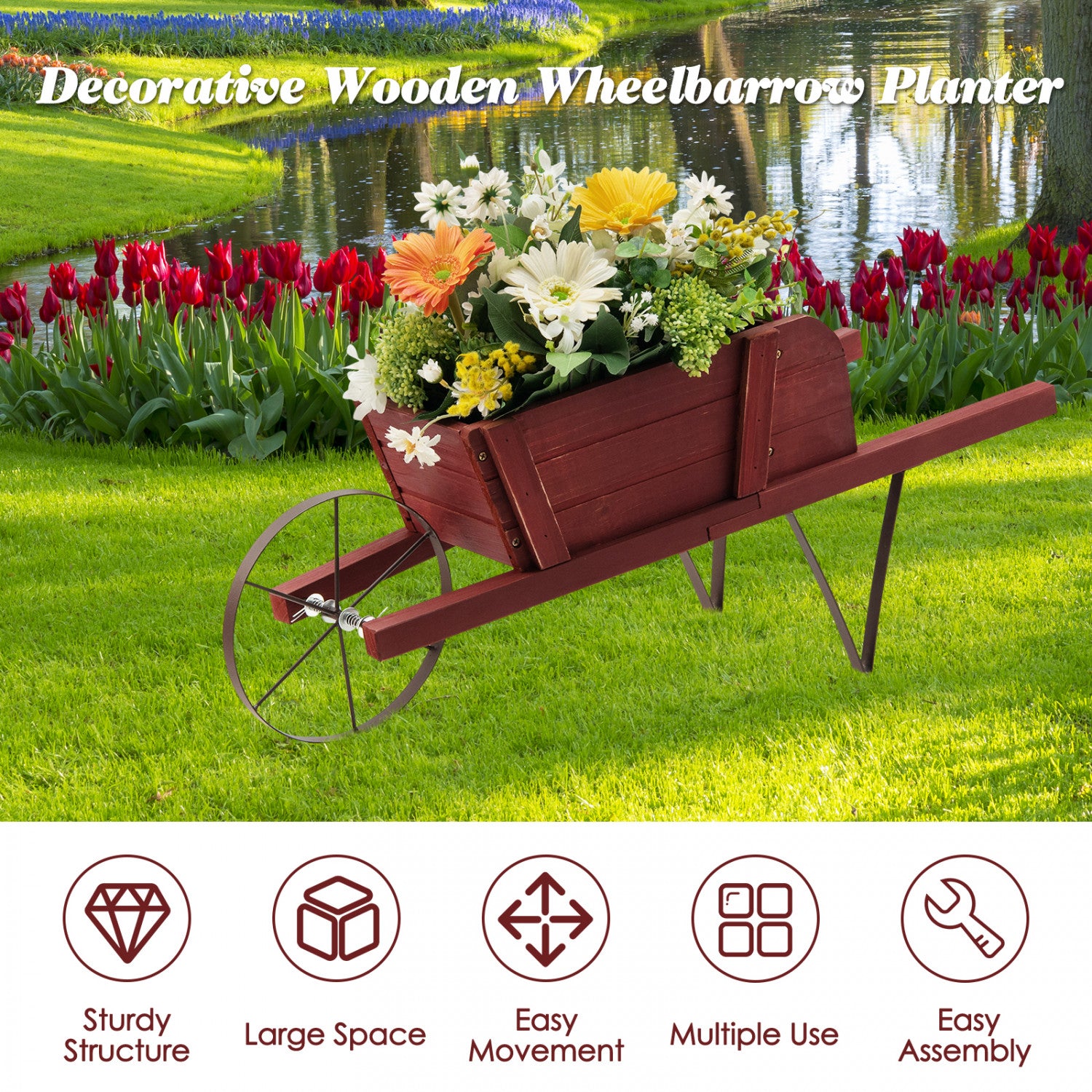 | Additional Information | Color: Red Material: Pine Wood, Metal Overall Dimensions: 27.5" x 10.5" x 11.5" (L x W x H) Diameter of the Wheel: 7.5" Weight Capacity: 11 lbs Net Weight: 2.5 lbs Package Included: 1 x Wooden Wagon Planter 9 x Magnetic Accessory 1 x User's Manual |