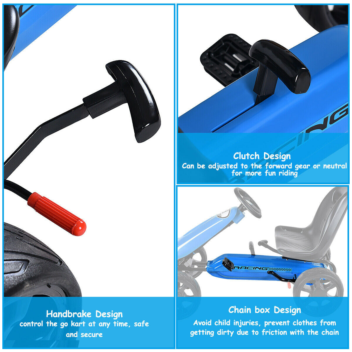 Featuring a sturdy construction equipped with 4 large high quality eva rubber wheels, this pedal go kart is long lasting, and operates quietly and steadily on roads. The go kart is fully pedal powered combined with a highly reactive handbrake system; it gives a safe yet fun karting experience for your children. With large and adjustable seat, the pedal go kart is suitable for children 3-8 years old. The pedal go kart is a combination of excitement, safety, and drivability. Surprise your children today!