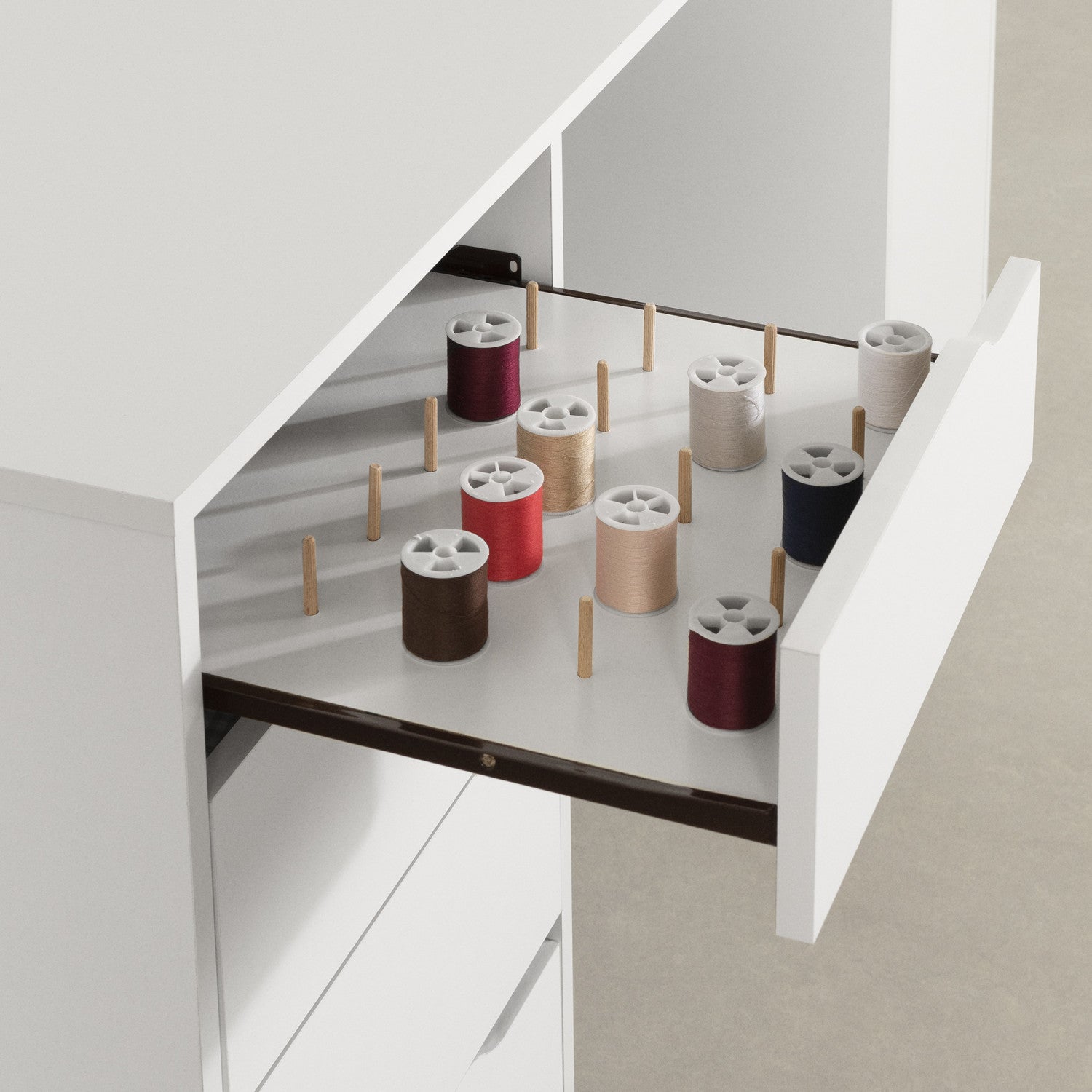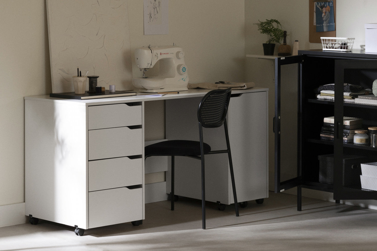 A perfect sewing table for the creative among us. Every artist needs a dedicated work space for sewing, doing crafts, or making jewelry. This craft table features 3 large drawers for your fabric, scissors, needles, and even more. It also has a slide out shelf with removable dowels for organizing and storing your spools of thread. Add to that the slide out module we’ve provided for even more storage. Pull it out for easy access to your sewing machine and whatever else you need. Since this storage part is retractable, it won’t look like this table is taking up too much space in your room. It’s specially adapted to your needs, so you won’t have to use the kitchen table anymore and put everything away when it’s time to stop. A trendy, sturdy craft table on wheels one thing you can be sure of: this versatile table will last for years! The very simple contemporary style gives your creativity free rein. Cutout handles mean that the fabric won’t get snagged on them. The large work surface is also covered in a scratch and water resistant finish. Finally, the desk is on wheels, so you can move it wherever you like, according to your mood and what you need at the time.