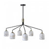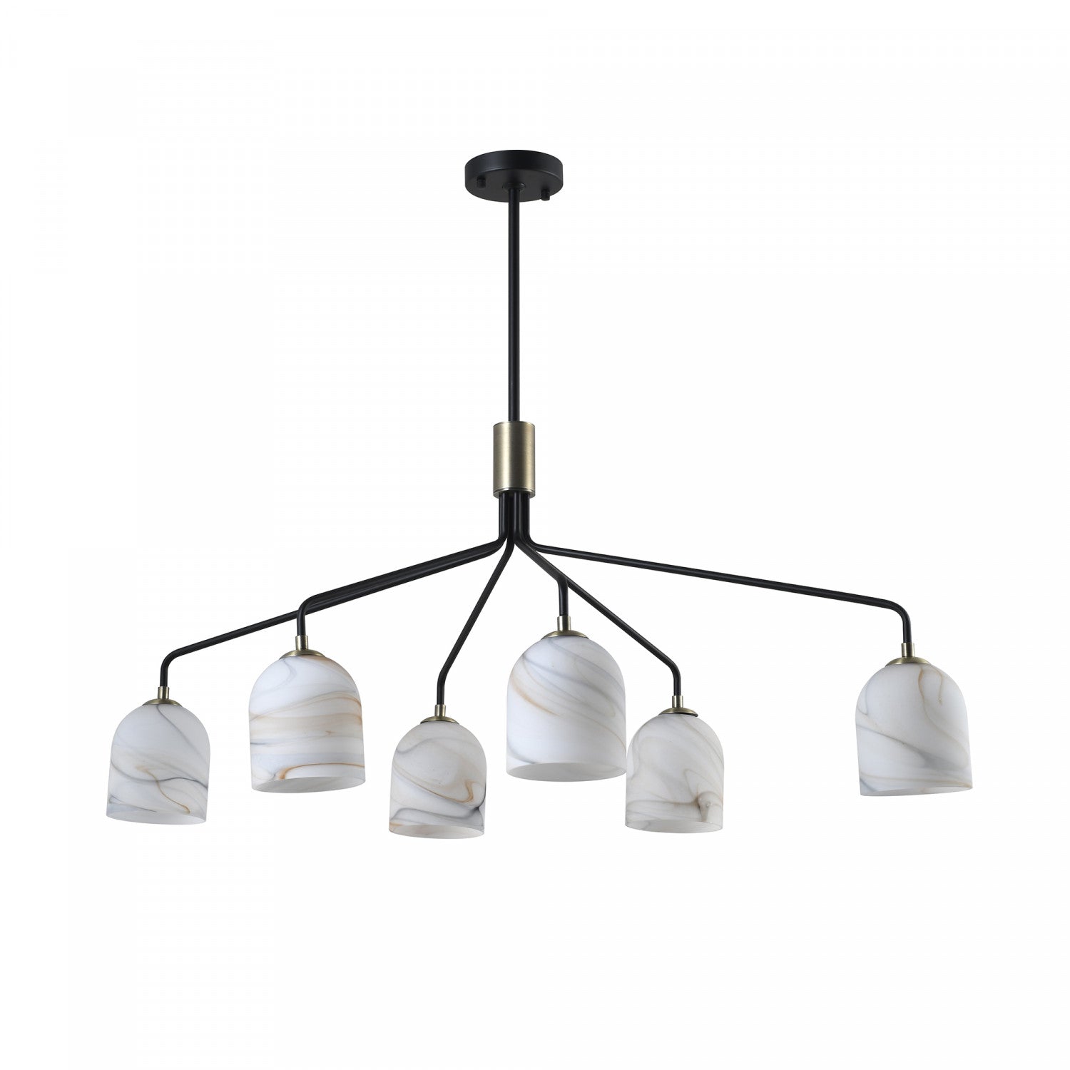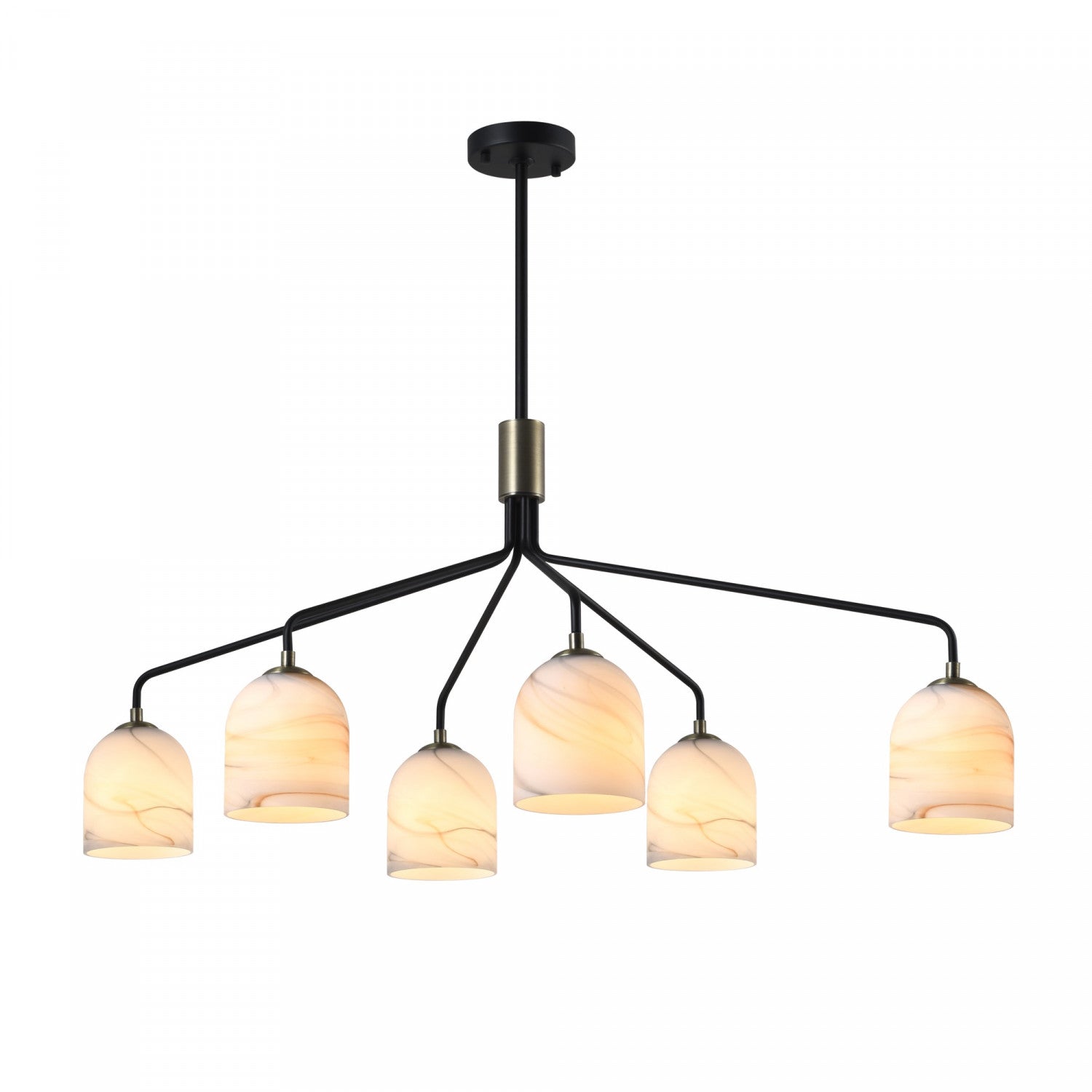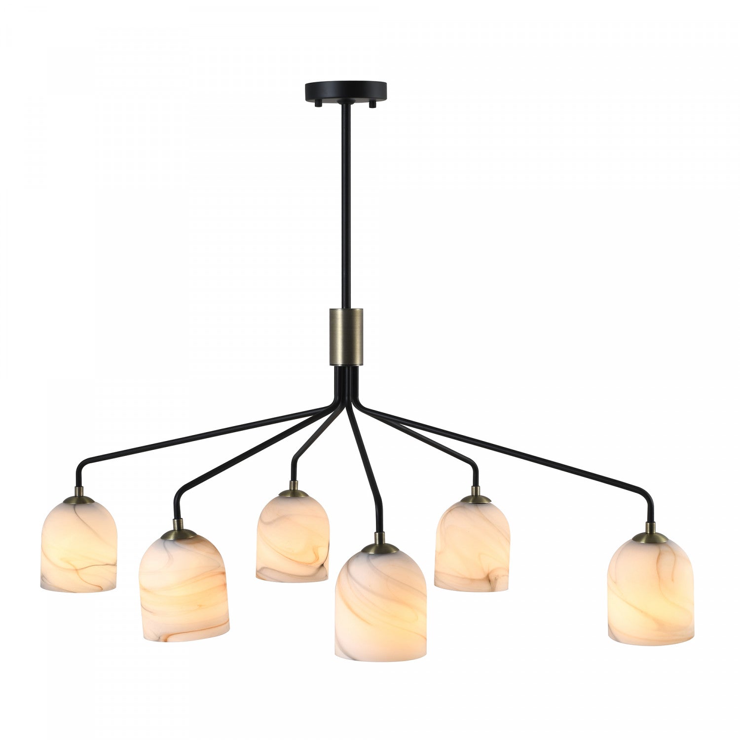 The crema collection 6 light oval chandelier by steven sabados of s&c radiates understated sophistication with its alabaster-style swirl glass, casting a warm, inviting glow. Its sleek black frame is beautifully complemented by brushed brass accents, creating a perfect harmony of modern sophistication and classic charm. Rods included for easy height adjustment to suit different height requirements.
