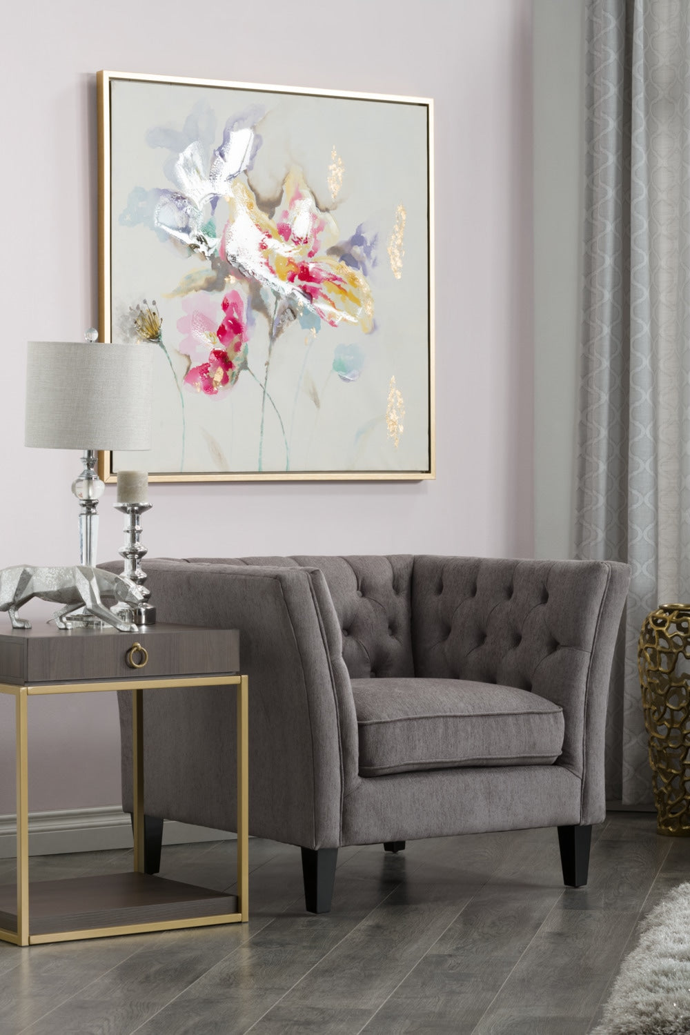 Chrome metal adds a modern, glam finish to the soft shade.