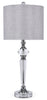 Go for the glam look with this crystal table lamp. The polished chrome base is wrapped in crystal for a glamorous, high-end look. A beige-grey linen shade tops this lighting accent and features metallic threads for a little extra oomph. Light up any room with style thanks to this chic lamp.