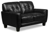 Get ready to relax and unwind on this black-hued Curt loveseat. This piece features button-tufted cushions and fabric piping on all of the seams for an elegantly modern take on retro furniture design. You'll love welcoming friends and family into your space and onto the genuine leather seating area. When you take a seat, you'll be instantly comforted by the high-density foam inside the cushions. With black-finished feet to provide support with style, this Curt loveseat adds sophistication and charm to your home.