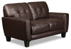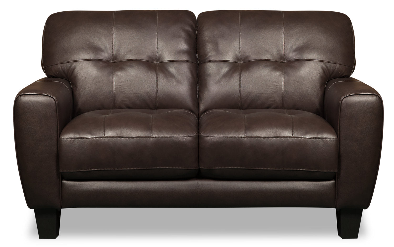 Get ready to relax and unwind on this dark brown Curt loveseat. This piece features button-tufted cushions and fabric piping on all of the seams for an elegantly modern take on retro furniture design. You'll love welcoming friends and family into your space and onto the genuine leather seating area. When you take a seat, you'll be instantly comforted by the high-density foam inside the cushions. With black-finished feet to provide support with style, this Curt loveseat adds sophistication and charm to your home.