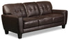 Get ready to relax and unwind on this dark brown Curt sofa. This piece features button-tufted cushions and fabric piping on all of the seams for an elegantly modern take on retro furniture design. You'll love welcoming friends and family into your space and onto the genuine leather seating area. When you take a seat, you'll be instantly comforted by the high-density foam inside the cushions. With black-finished feet to provide support with style, this Curt sofa adds sophistication and charm to your home.