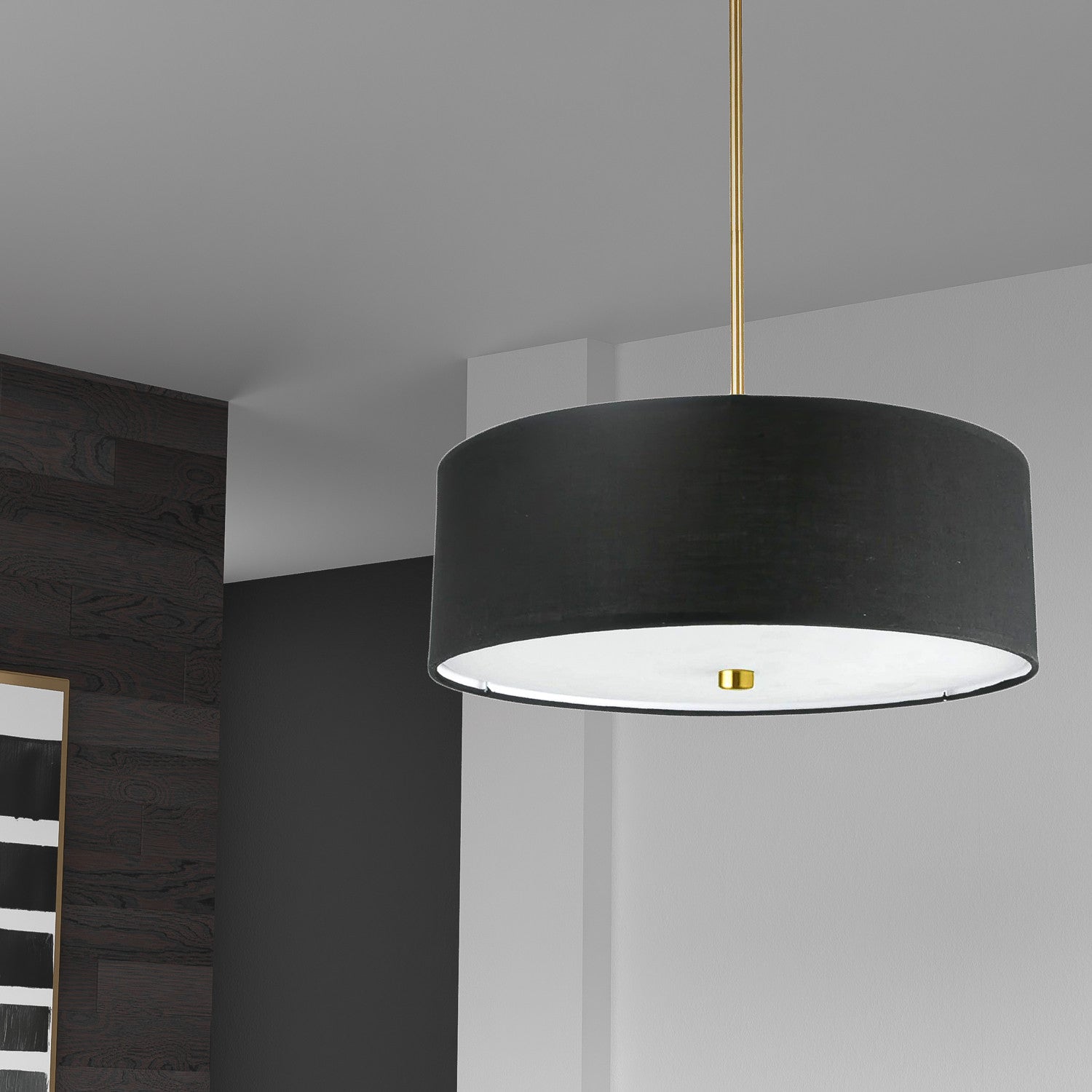 Mid-century, modern or contemporary, the Everly family of lighting will add a fashionable presence to your home decor. The pendant design comes in a one or two tier construction. The metal frame drops to a relatively narrow drum shade, with a contrasting inner shade. From the metal frame to inner and outer shades, color options range from monochromatic to dramatic contrast. With its elegant proportions, the Everly family of lighting brings an element of luxury to foyers, living rooms or kitchens.
