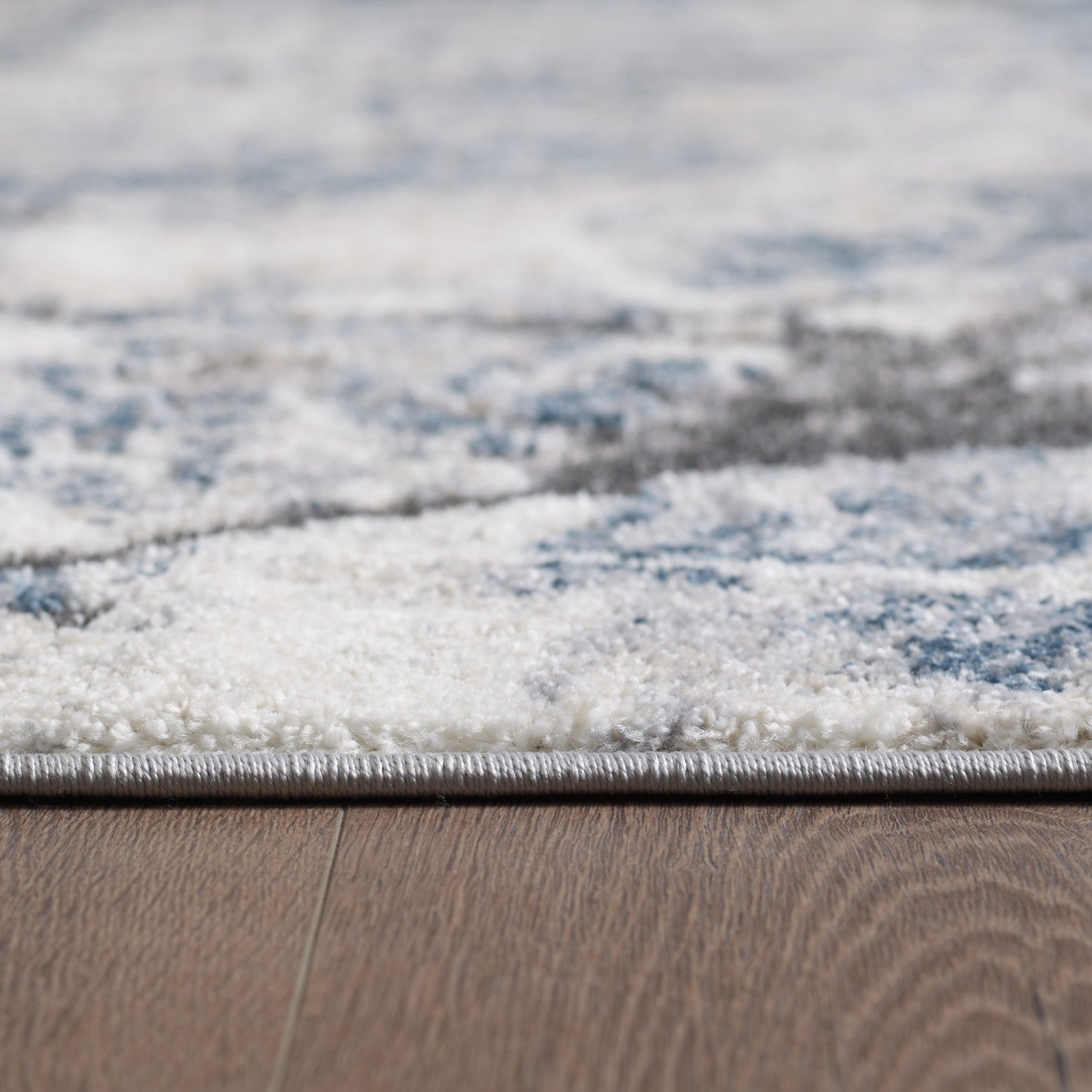 This beautiful modern area rug features an exquisite Vintage Splash design and a blend of off white, blue, and grey colours.