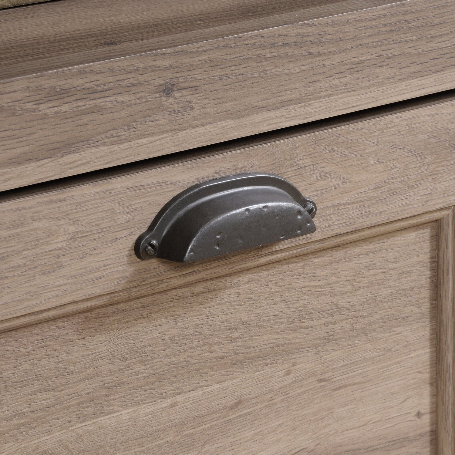 | Storage Options | Two small drawers, one file drawer for letter-sized hanging files, two open shelves and more shelving behind the cabinet door. |