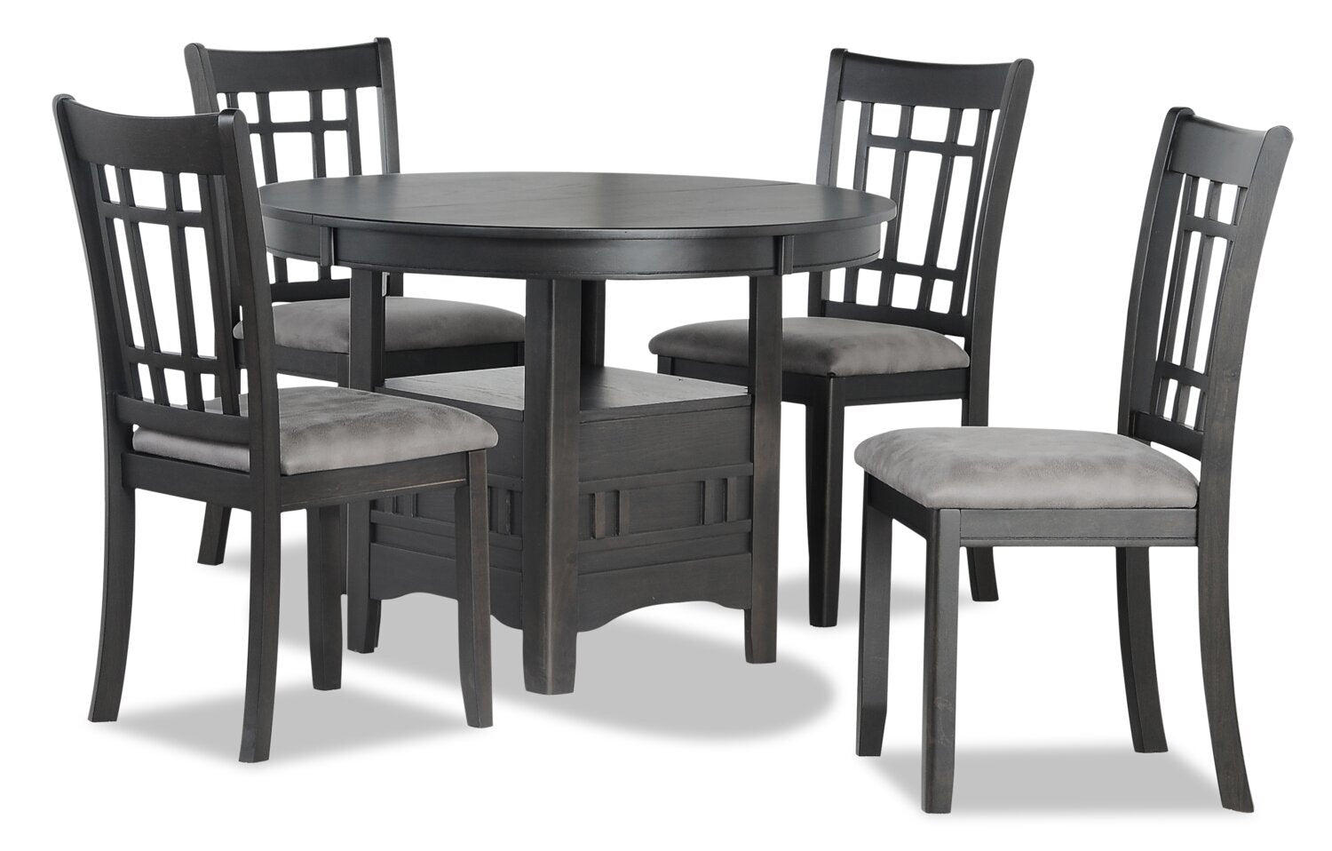 Gather your family, large or small, around this five-piece Dena grey-brown dining package to break bread and make memories. Oak veneers are applied over a rubberwood base to create an appealing look. Meanwhile, high-density foam makes sitting through multiple courses or hours of homework comfortable, as the leather-look cover offers breathability with style. A compact design allows this set to fit into a limited area – yet if everyone comes over, use the removable table leaf for an extra 18 inches of space. Put this Dena five-piece set at the heart of your family's magical moments.
