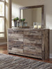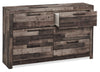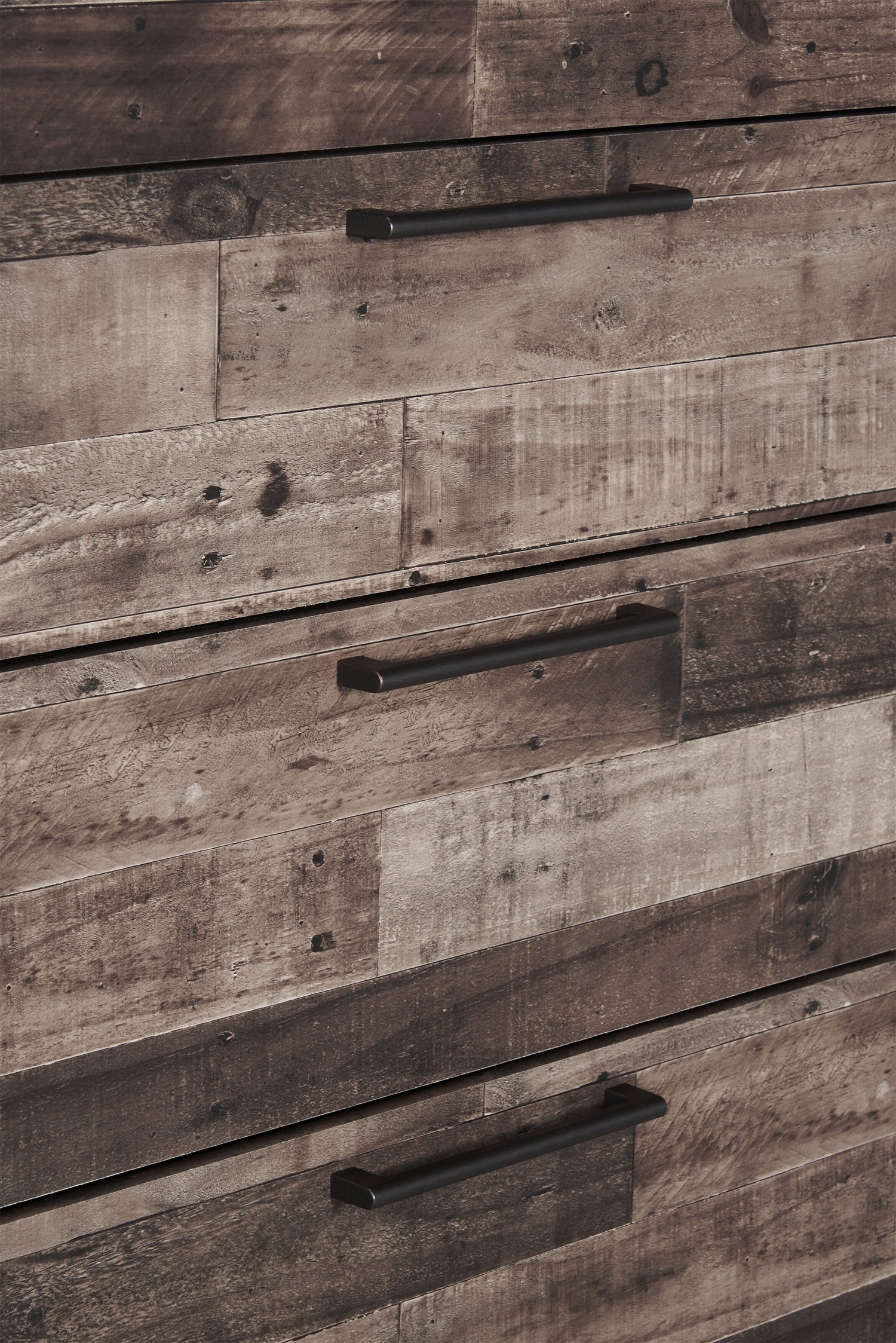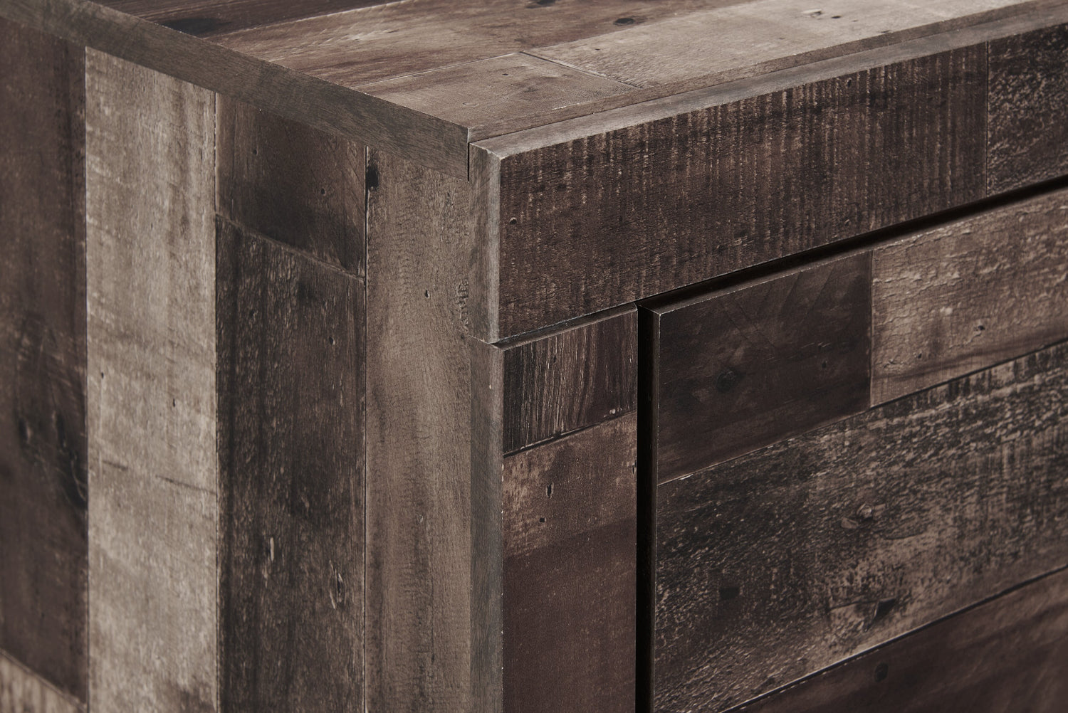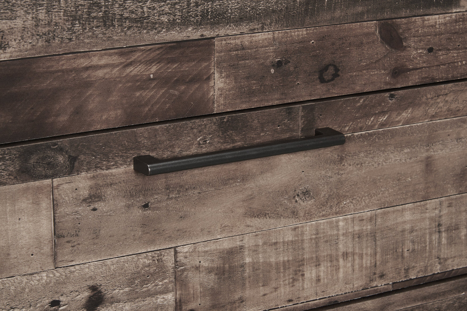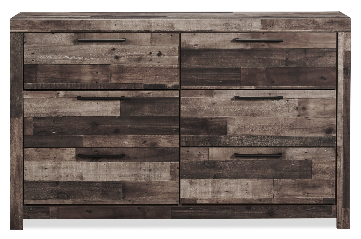 Enjoy that outdoorsy feeling from the comfort of your home when you add this Derekson dresser to your bedroom. Faux-pine pieces are fitted together to create a butcher block pattern across the top surface, with each grey-hued panel sporting a natural wood grain design. Sleek metal drawer pulls allow you to smoothly open each of the six drawers, and the linen-patterned drawer lining makes them the perfect place to store even the most delicately knit sweaters. Whether for the cottage or the loft, this dresser is a charming addition to your space.