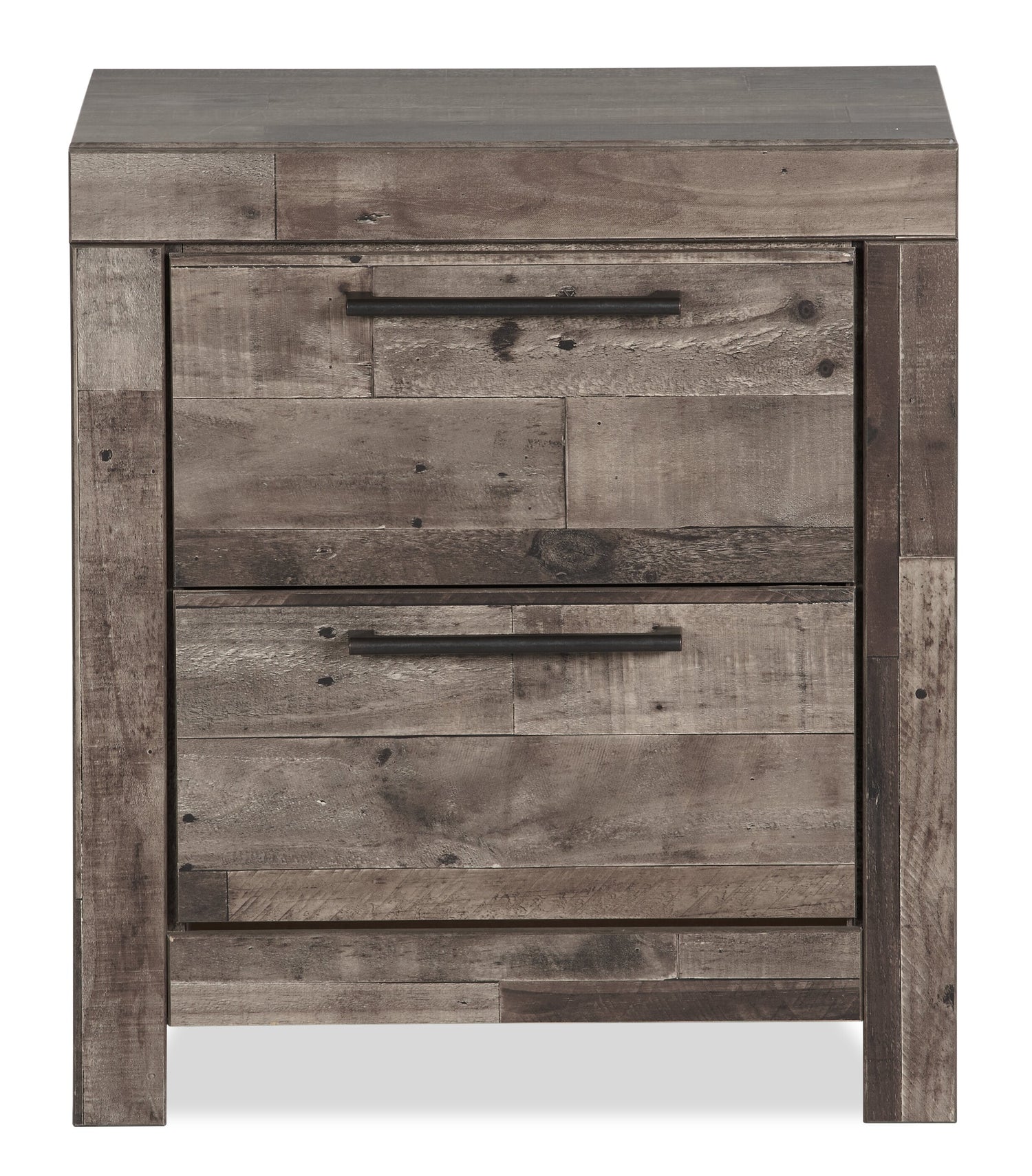 Enjoy that outdoorsy feeling from the comfort of your home when you add this Derekson nightstand to your bedroom. Faux-pine pieces are fitted together to create a butcher block pattern across the top surface, with each grey-hued panel sporting a natural wood grain design. Sleek metal drawer pulls allow you to smoothly open each of the two drawers, and you can plug your smartphone or wearable technology in to one of the two USB ports to charge. Whether for the cottage or the loft, this nightstand is a charming addition to your space.
