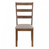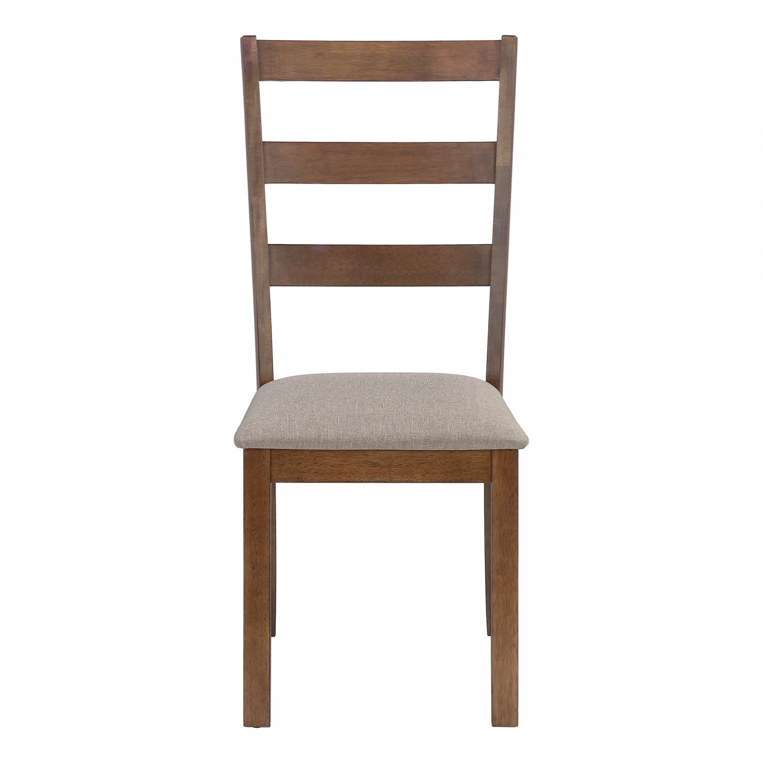 Add some warmth to your casual or formal dining room with this set of 2 armless dining chairs in a cozy walnut grain finish. The seat is upholstered in a durable beige fabric with thick padding for maximum comfort and an open ladder back for added style. Made from quality engineered wood, the subtly slanted open, ladder back frame and straight front legs with curved back legs, provides reliable stability while enjoying conversations around the dinner table. The simple design and neutral finish of these armless chairs are appealing for a range of decor styles, and suitable to place in any room. Minor assembly is required.