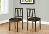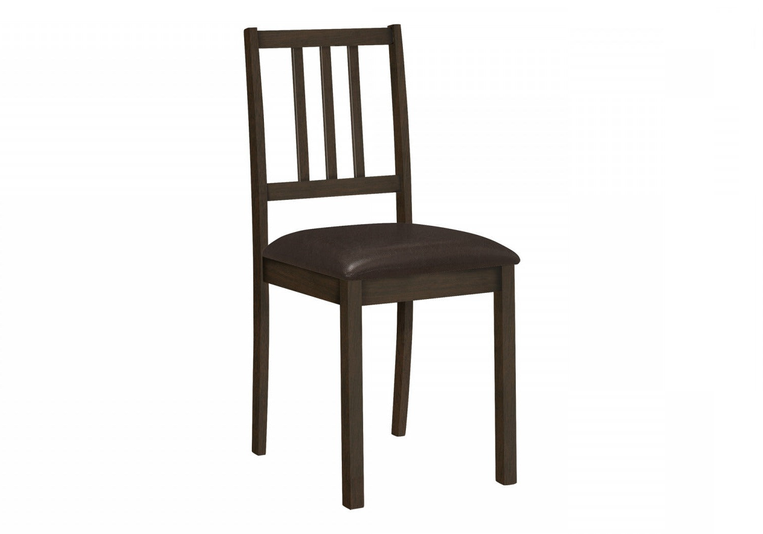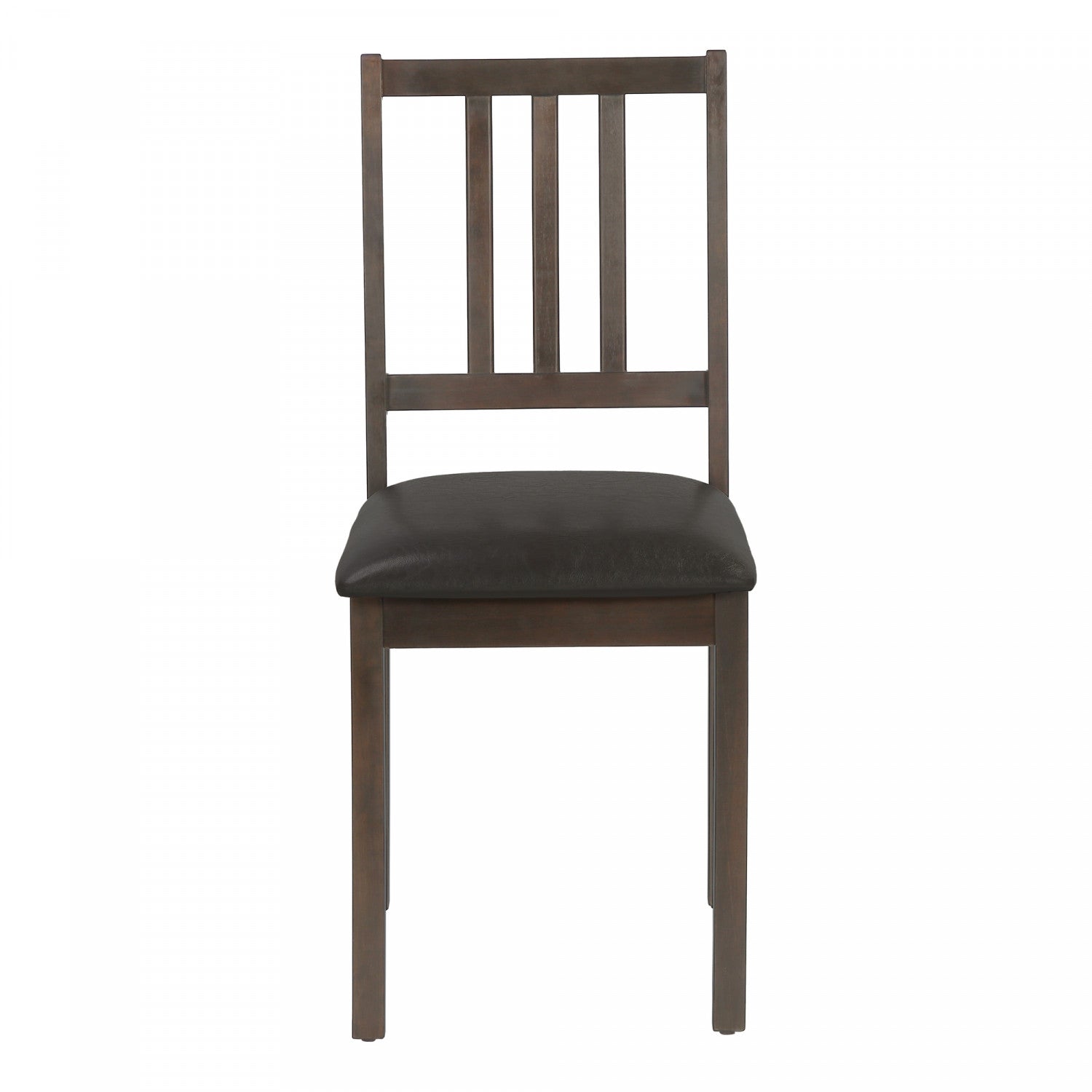 Bring this set of 2 contemporary dining chairs to the table and start a conversation! The open slat back design and solid engineered wood frame in an espresso finish aims for maximum support and comfort. The thick firm cushioned seat, upholstered in a durable leather look fabric with a dark brown finish, makes it easy to keep clean. The simple design and neutral finish of these armless chairs are appealing for a range of dining room décor styles. Minor assembly is required.