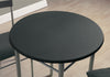 This intimate three piece bistro set offers a simple contemporary look for your dining area. The round table features a solid black pvc top, and sturdy charcoal grey steel metal tube legs. The armless side metal chairs feature a horizontal slat back with cushioned and upholstered seats in black microfiber for your comfort. The clean lines of this set creates a modern industrial look that you will love in your condo, apartment, or small house.