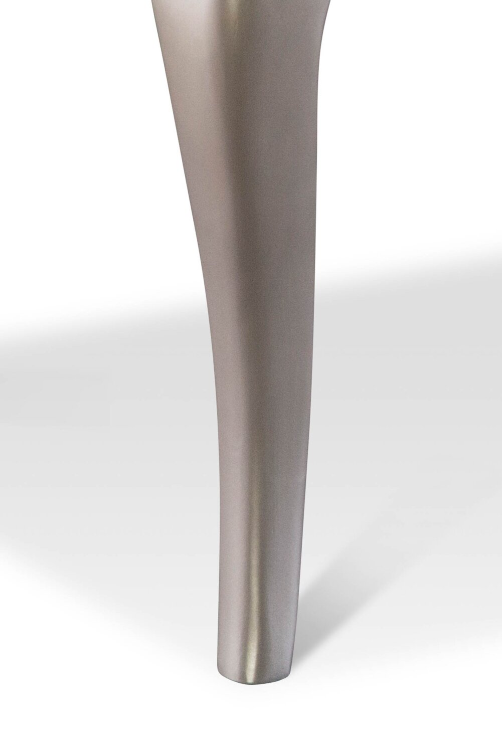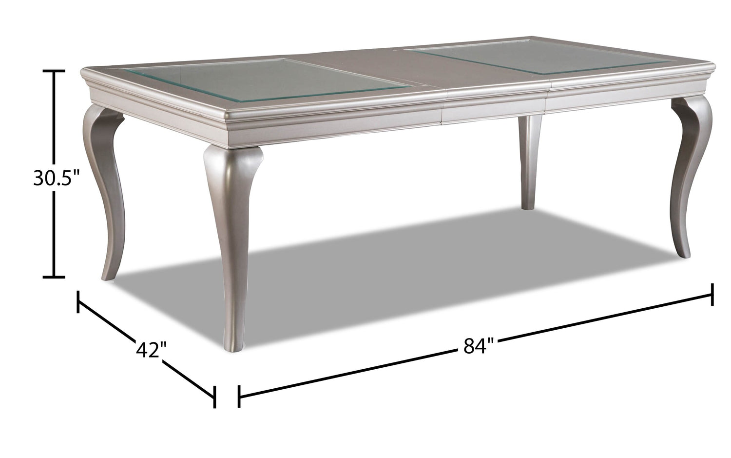 Give your guests the royal treatment with this dazzling Diva dining table. Traditional shapes are given a modern glam treatment to stunning effect. Finished in an eye-catching platinum silver, this table will be a dramatic addition to your home’s dining room. Cabriole legs lend gorgeous detail as the tabletop features inset opaque glass panels. Live lavishly with this gorgeous Diva table.