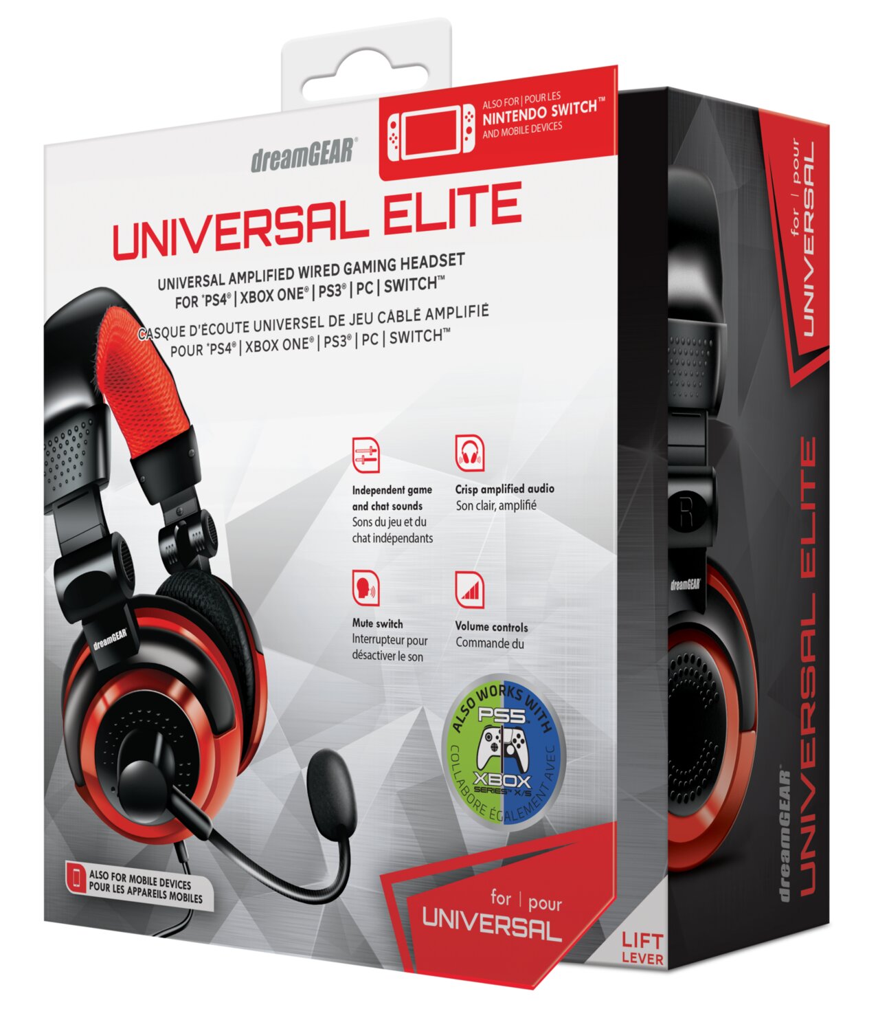 The Universal Elite Gaming Headset is compatible with PS4, PS5, Xbox One, XBOX Series X/S, PC and offers simultaneous game sound and live chat. It includes a high performance microphone with flexible boom and is perfect for gaming on Xbox LIVE®, the PlayStation® Network and the Nintendo® Network. The headset features independent game and chat volume controls, cushioned mesh ear pads for maximum comfort and 15 feet of primary cable.