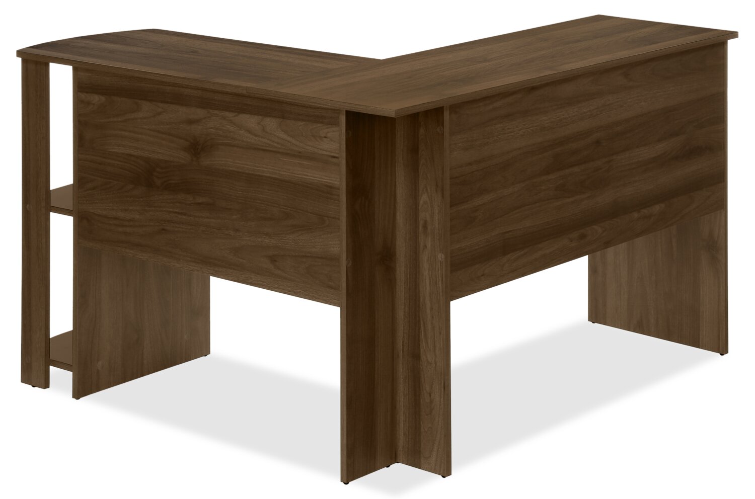 With a generous work surface and storage space, this Eason L-shaped desk is ideal for students or offices with limited space. Two convenient shelves provide room to neatly organize books, binders and school supplies. Plus, the desktop is divided into two segments, so you can change up your workspace. Finished on all sides in a neutral tone, this space-saving piece is intended for placement in a corner but can be positioned anywhere in a child's bedroom, a student’s dorm room or in your office.