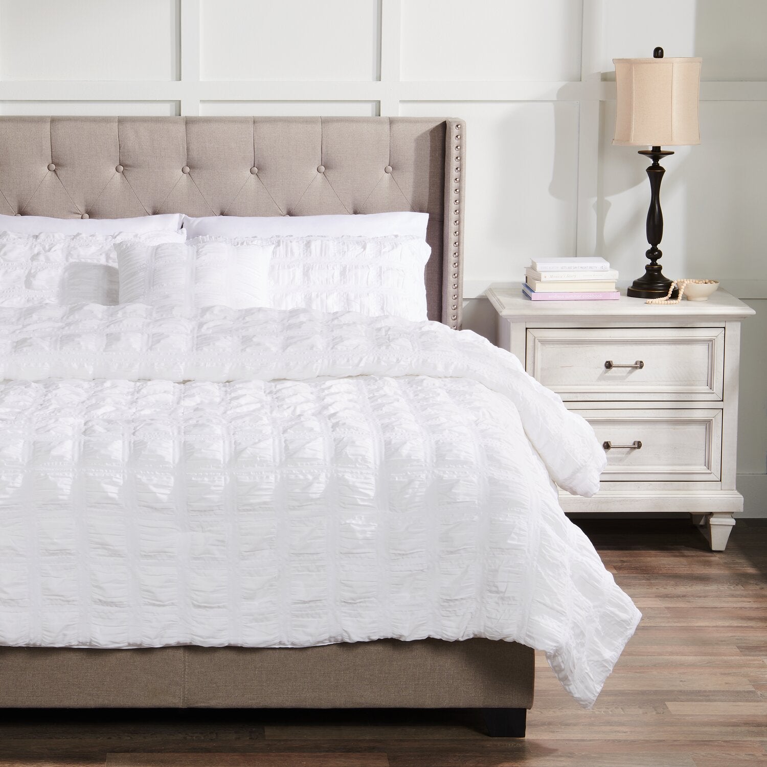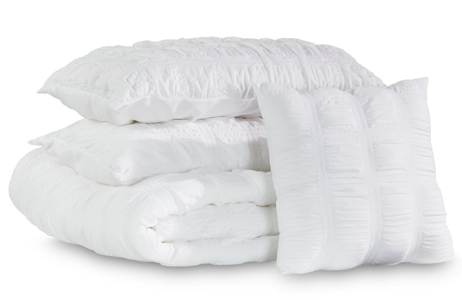A modern bedroom refresh awaits with this Elanna four-piece king comforter set. The brilliant white colour will bring an airy essence to your space, making it feel fresh and open. Enhanced with subtle texture and finished in a neutral tone, you can place this set in almost any bedroom thanks to its simple appearance. Pair this comforter with bright sheets for a fun look or opt for grey or white to keep a clean, calm aesthetic. Plus, you can stack the decorative pillow with your main pillows to dress up your room even more.