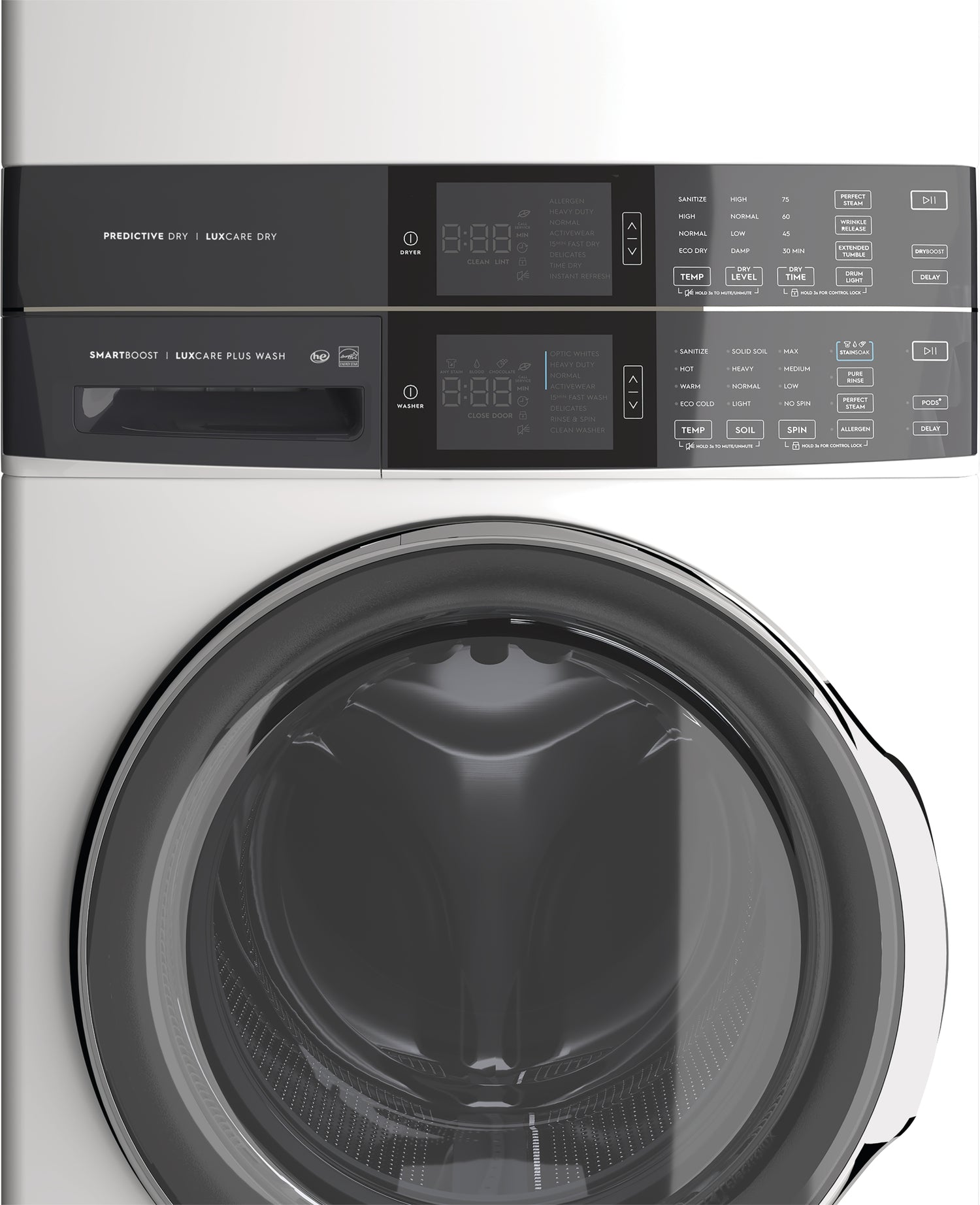 Vertical Stacked Design: SmartBoost: LuxCare Dry System: Optic Whites™: Instant Refresh Cycle: StainSoak™: Sanitize Setting: Fast Wash and Fast Dry: Adaptive Dispenser™: |