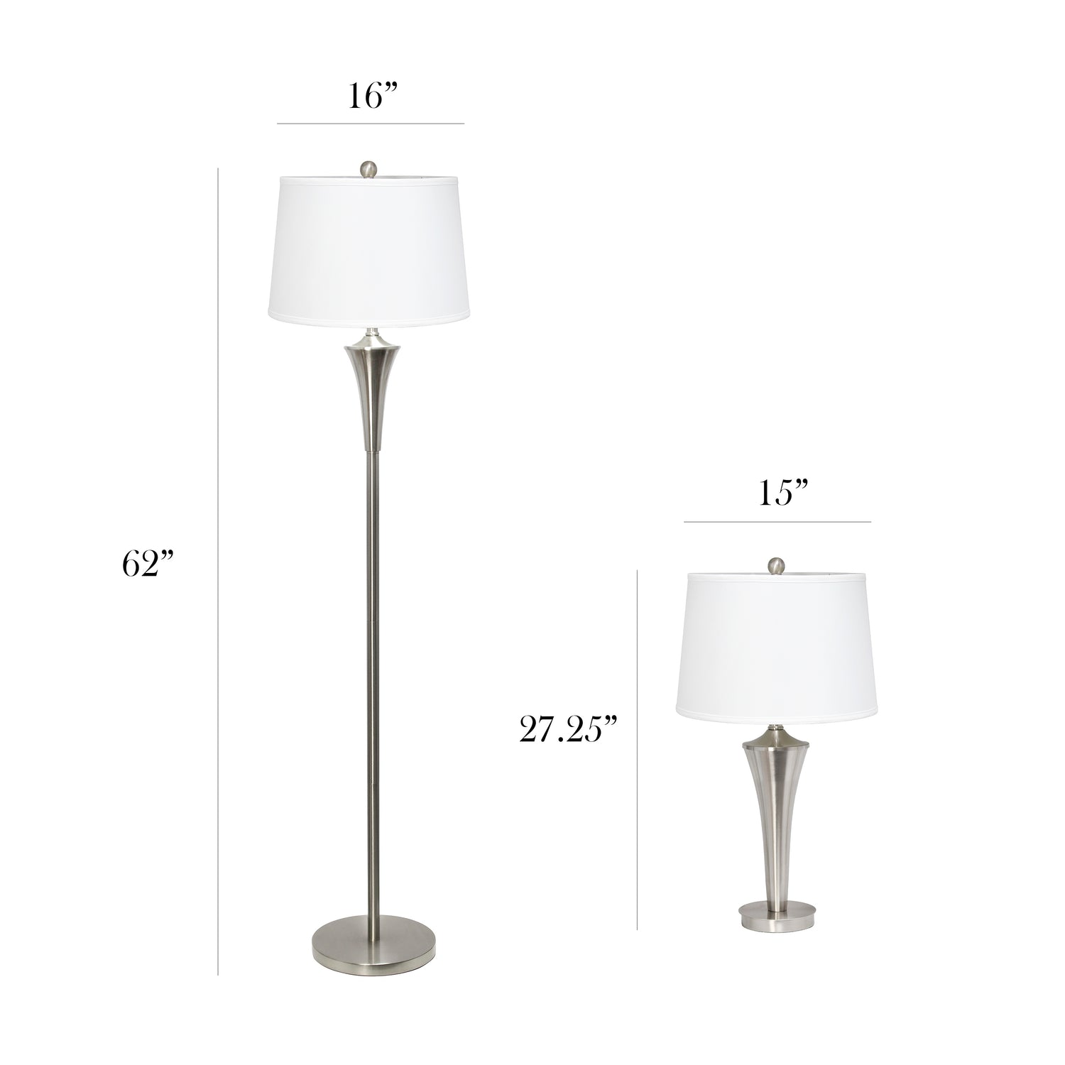 Redecorating or moving into a new space can be wonderful when you find those pieces that transform a basic room into a page right out of your interior design magazine! Get inspired to upgrade your home and/or office by purchasing this sleek and modern table and floor lamp 3 pack set. Perfectly adaptable to both professional and personal spaces, the attractiveness of the brushed nickel finish combined with the sleek, tapered design balances perfectly against the white fabric shade to enhance your space into a room you love. What a great way to beautify your space with a small investment into a timeless lamp set!