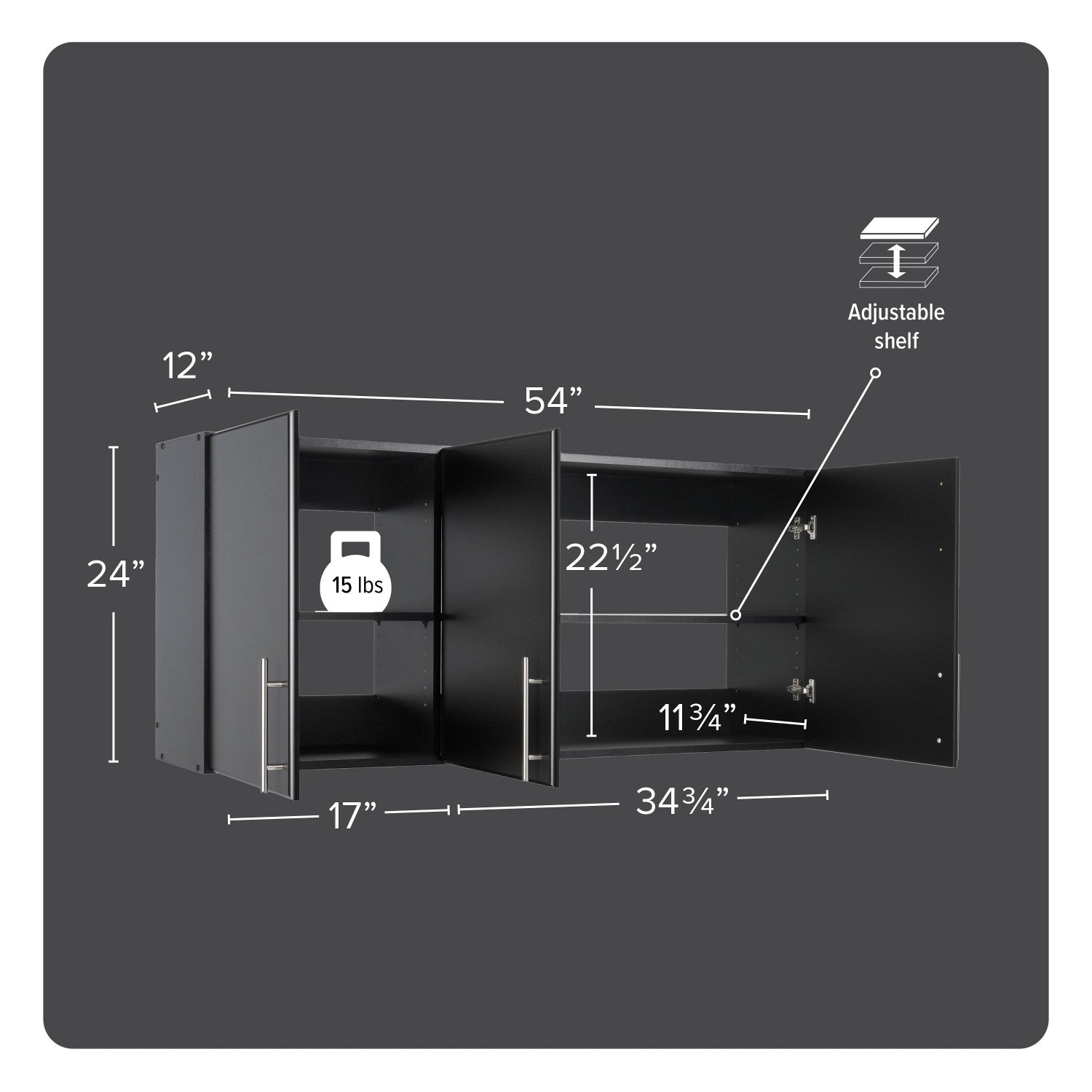 The Elite 54 in. Wall Cabinet was made with your laundry room in mind. At 54 inches wide, this 3-door cabinet is designed to fit above your standard washer and dryer. The 12-inch depth ensures you have ample clearance for loading and sorting laundry, and with doors that can be installed to open to the left or right, it's versatile enough to suit any space. Customize the three adjustable shelves to store your laundry supplies and other items. Ideal as a stand-alone piece, and not limited to the laundry room, this cabinet is part of the ultra-versatile Elite Collection.