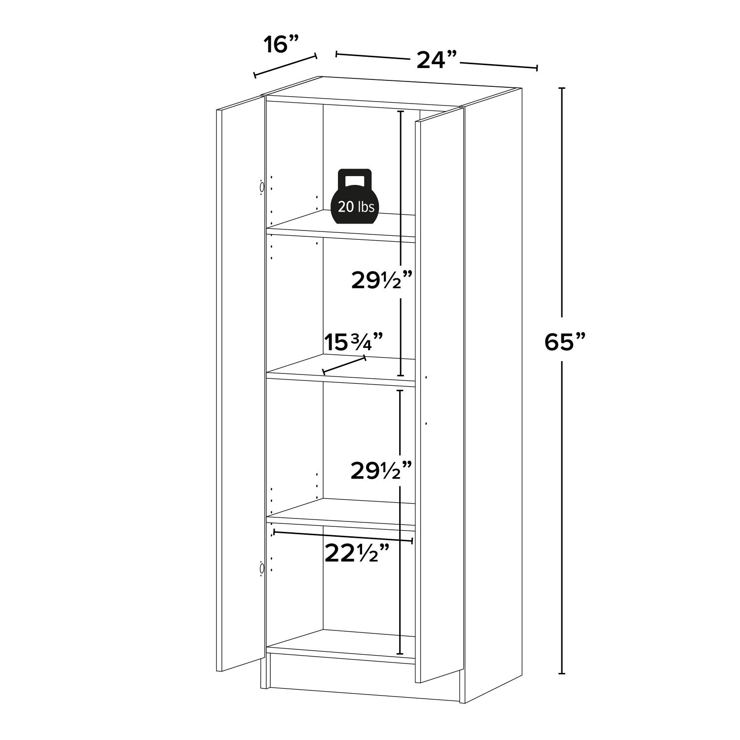 Width: 24" (61.0 cm) Height: 65" (165.1 cm) Depth: 16" (40.6 cm)