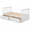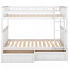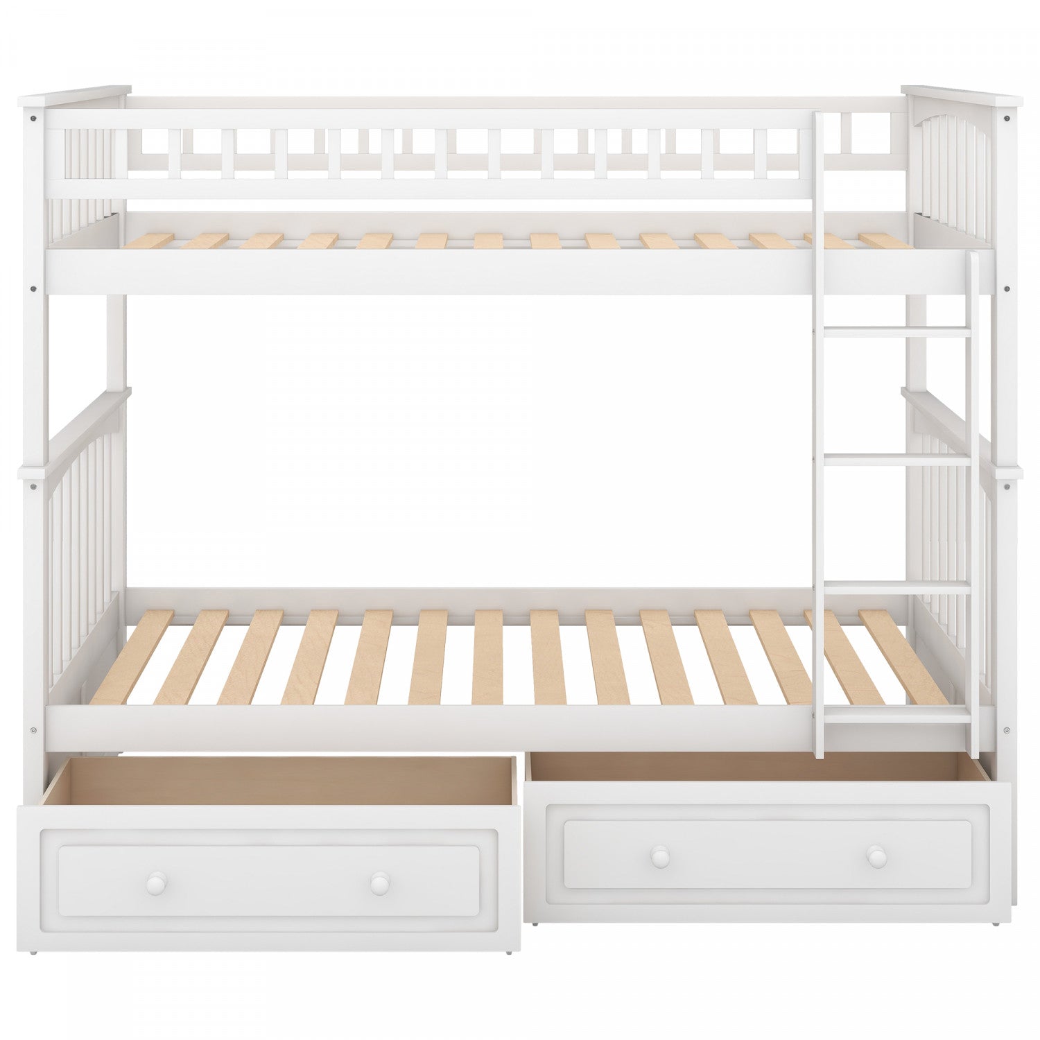 The twin over twin bunk bed combines functionality and flexibility in one smart design. Built from solid pine wood and engineered wood, it features two underbed drawers with smooth-rolling wheels for convenient storage. This bunk bed easily converts into two separate twin beds to suit your space. With clean white finishes and fence-style guardrails, it’s both safe and stylish—no box spring required.