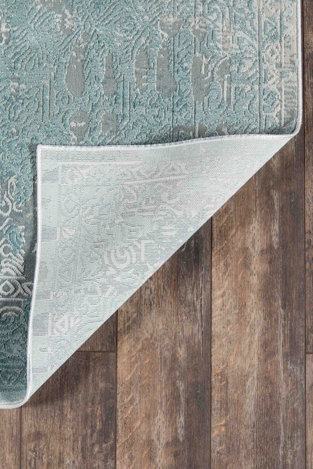 Purposeful shading throughout the field of this transitional area rug lend the distinctive floor accent an aire of design history. A traditional repeat of ornamental medallions and surrounding border peer through washed out shadows of light blue, dove grey and ivory that imply an antique essence. Resilient synthetic threads make this durable floorcovering an inspired flooring accent for high-traffic areas of the home.