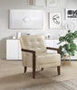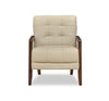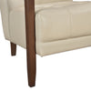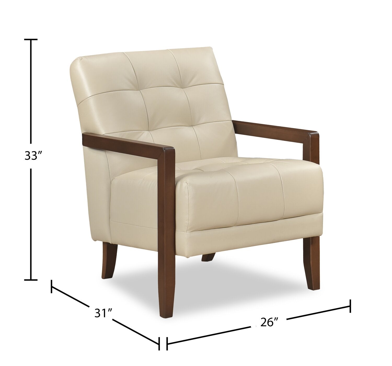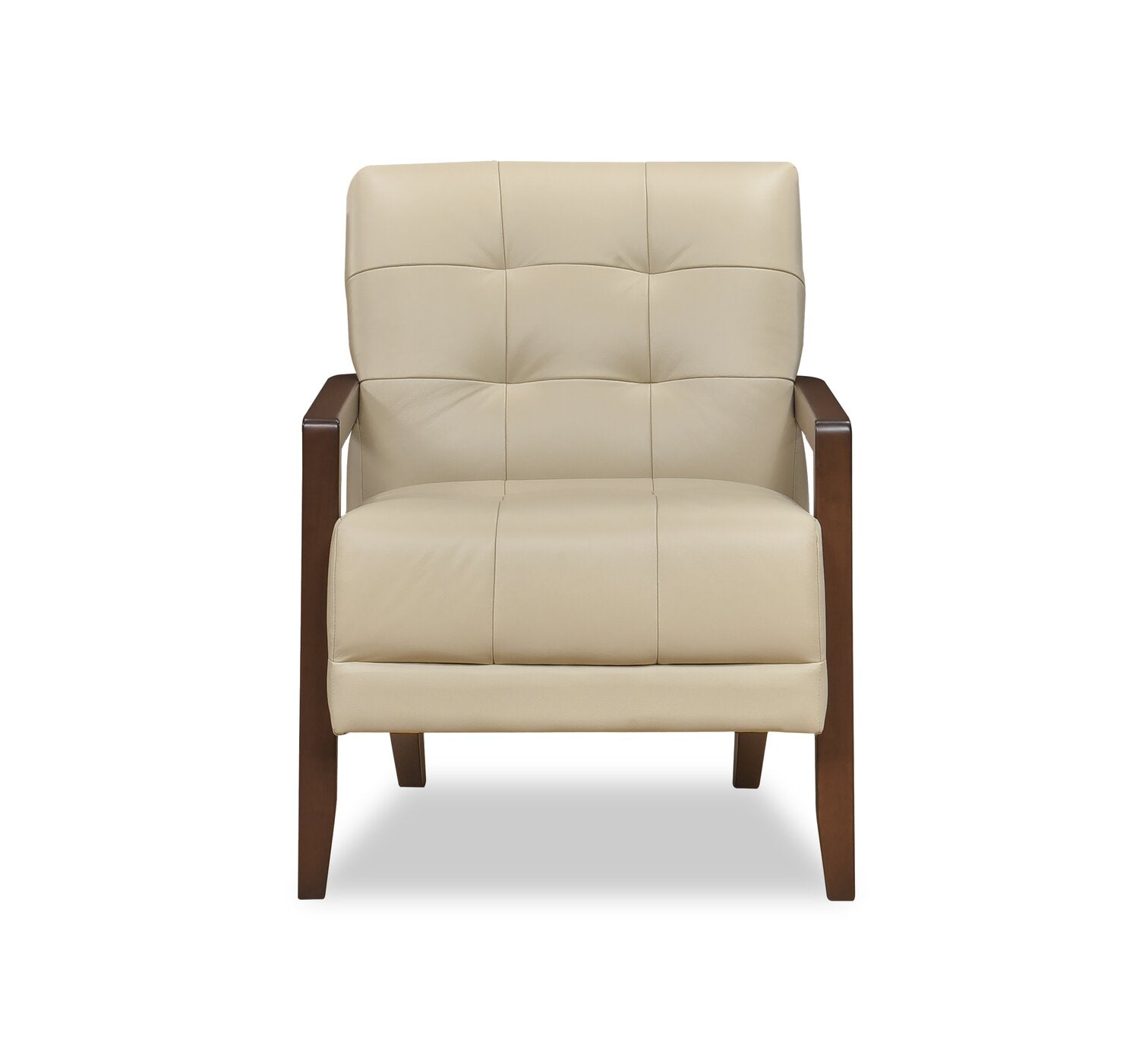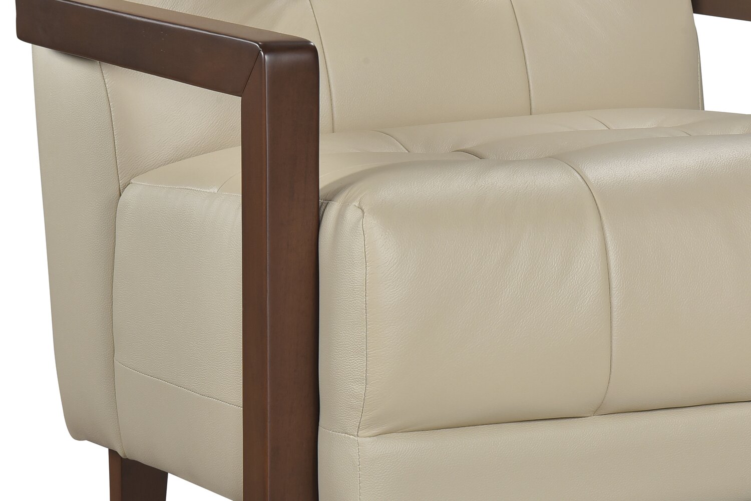 Effortlessly graceful and elegant in every aspect, this Enzo accent chair is a paragon of timeless style. Wrapped in gorgeous beige genuine leather along the front seating area and faux leather on the back and sides, this piece will make any room feel complete. Its stunning wood frame complements the light upholstery to create a picturesque display of mid-century modern and retro designs. Plus, biscuit tufting accentuates plush cushions, reinforcing this chair’s vintage aesthetics. Lean back in sophisticated style as you revel in comfortable high-density foam cushions and sleek, eye-catching details with the Enzo.