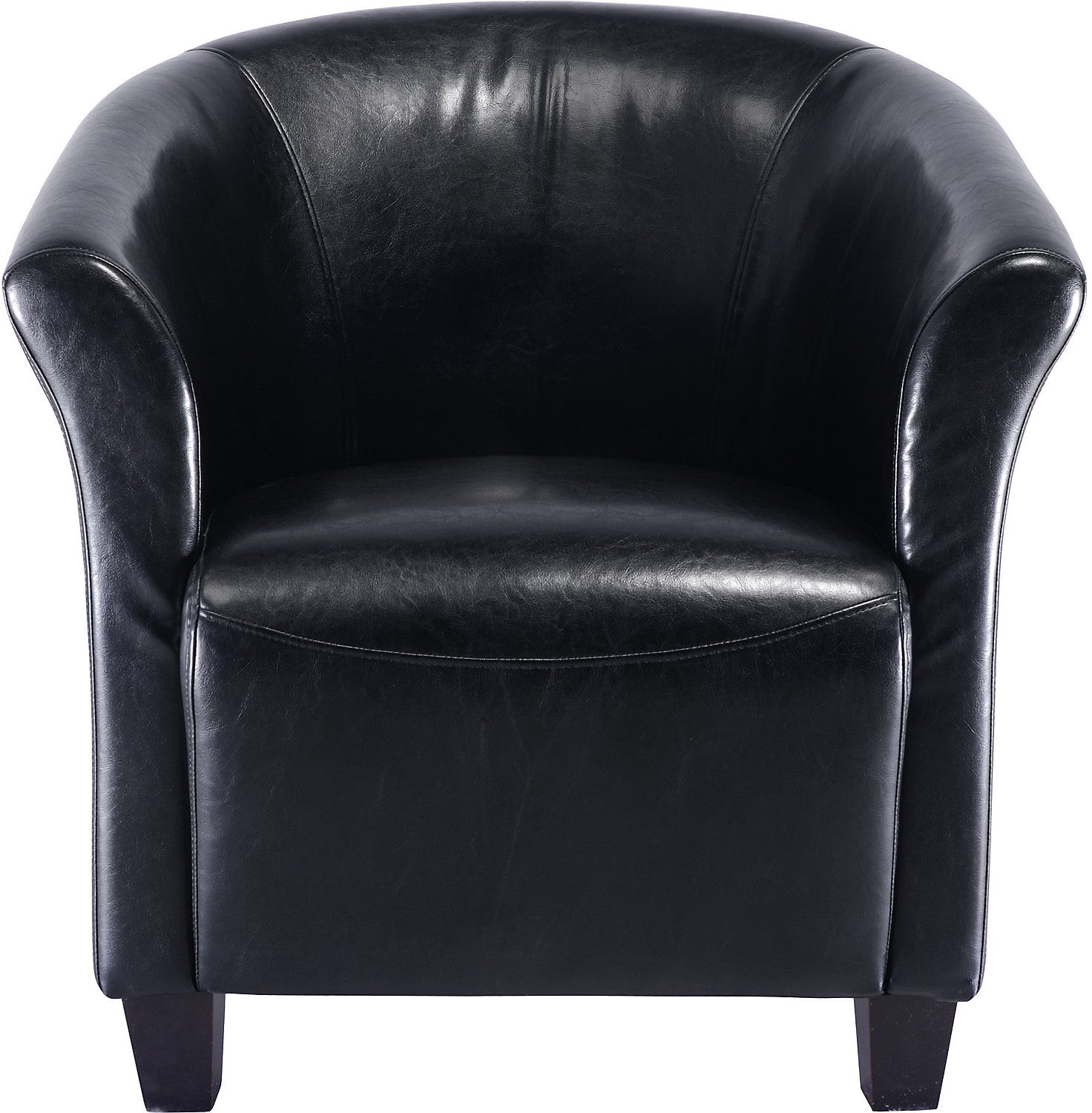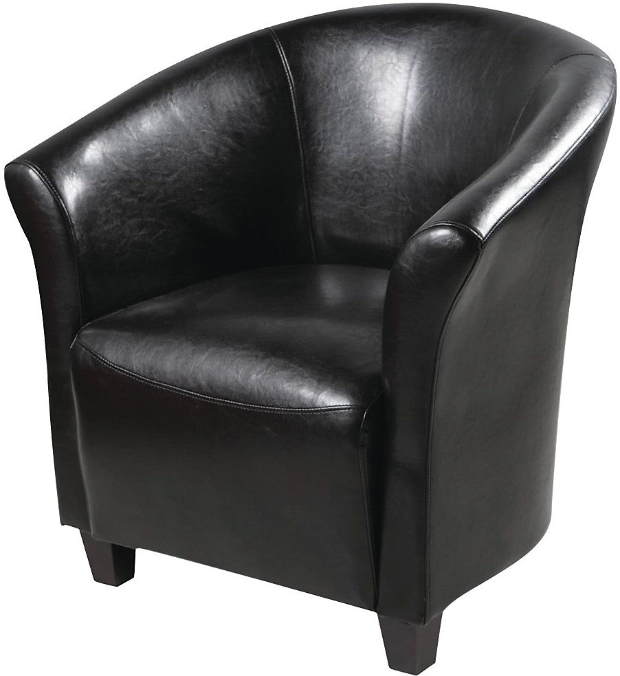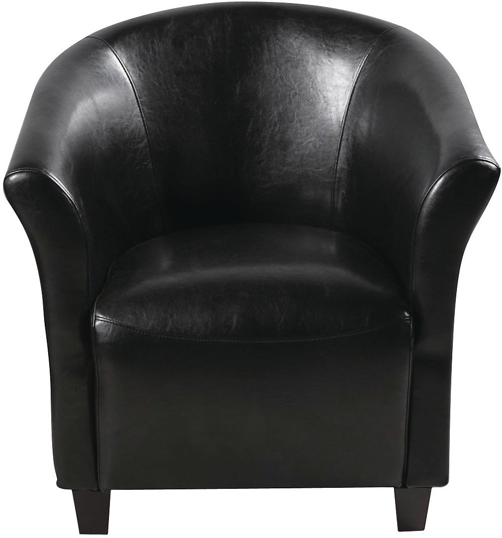 Style and sophistication are as much a part of this Ethan chair as its sleek black covering, but what distinguishes it from other accents is its friendliness. The bucket seat and small size give the user a snug, cozy feeling without the need for copious pillowing in the upholstery. The small size also encourages a more social atmosphere amongst those seated, making this an ideal choice for a living or family room.