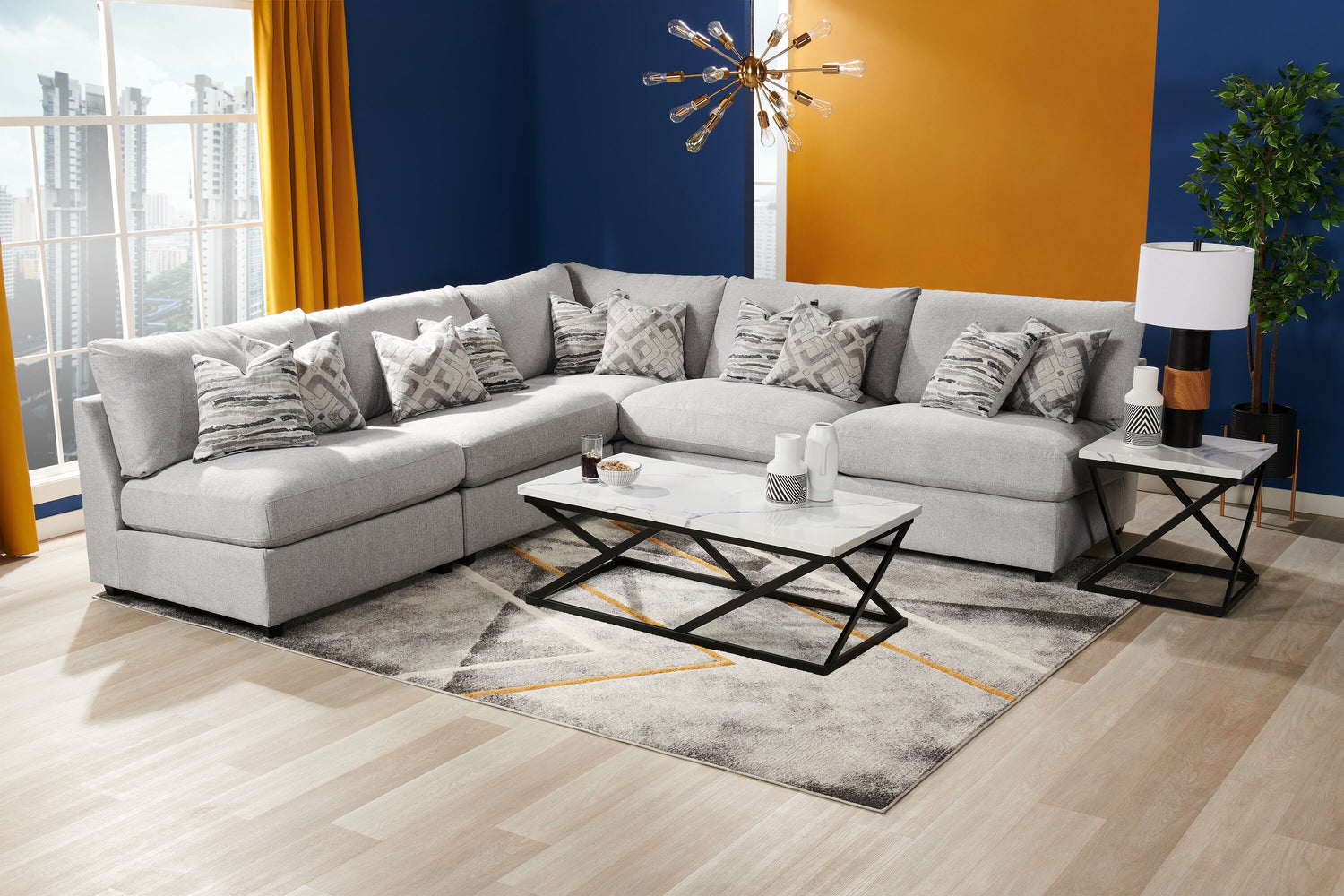If you're looking for a way to ensure your living room suits your needs, this Evolve modular armless chair from Scott Living will be right up your alley. With its soft lines and low profile, this piece adds a subtle chic style that will complement most interiors. The grey linen-look fabric and lavish feather- and foam-stuffed cushion welcome you to lounge comfortably all night. Trendy dark-stained plastic legs elevate the piece, adding a charming appeal. Add matching corner chairs for more seating or ottomans for storage and let your living room evolve into something that is just for you.