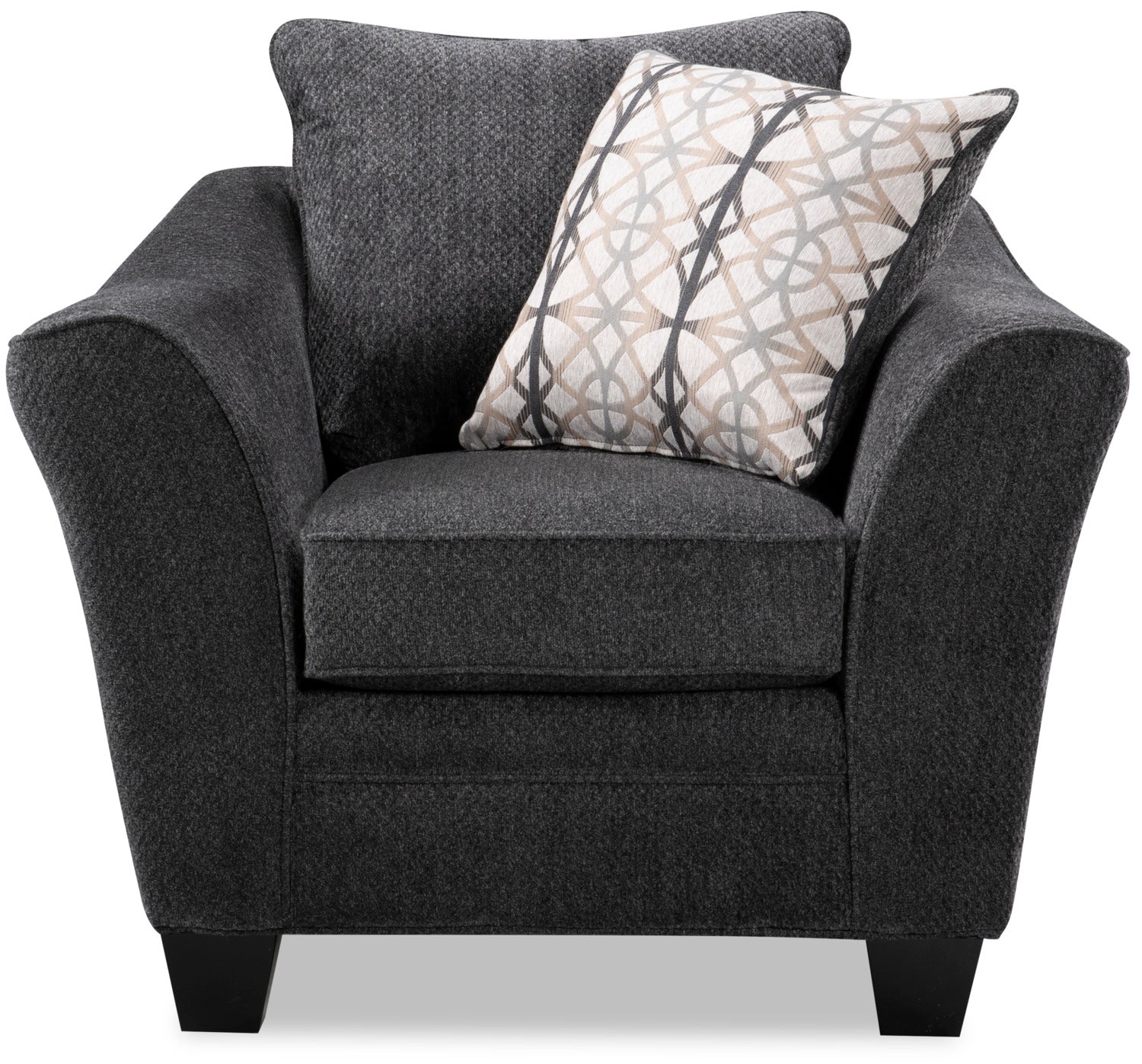 Give your home an inviting and chic appeal with this charcoal Febe condo chair. Cozy chenille covers the entire furniture frame for a seating space you'll want to relax on. The seat cushion is filled with plush high-density foam, while the back cushion contains soft fibre fill to comfort your back. With flared armrests and designed for smaller living spaces, this condo chair is a fantastic complement to many different home decor styles.