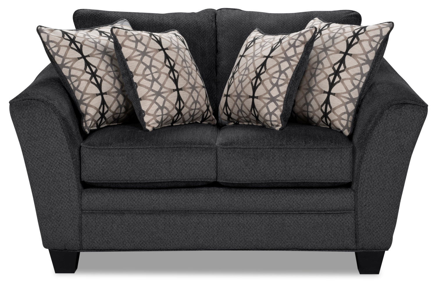 Give your home an inviting and chic appeal with this charcoal Febe condo loveseat. Cozy chenille covers the entire furniture frame for a seating space you'll want to relax on. Each of the seat cushions are filled with plush high-density foam, while the back cushions contain soft fibre fill to comfort your back. With flared armrests and designed for smaller living spaces, this condo loveseat is a fantastic complement to many different home decor styles.