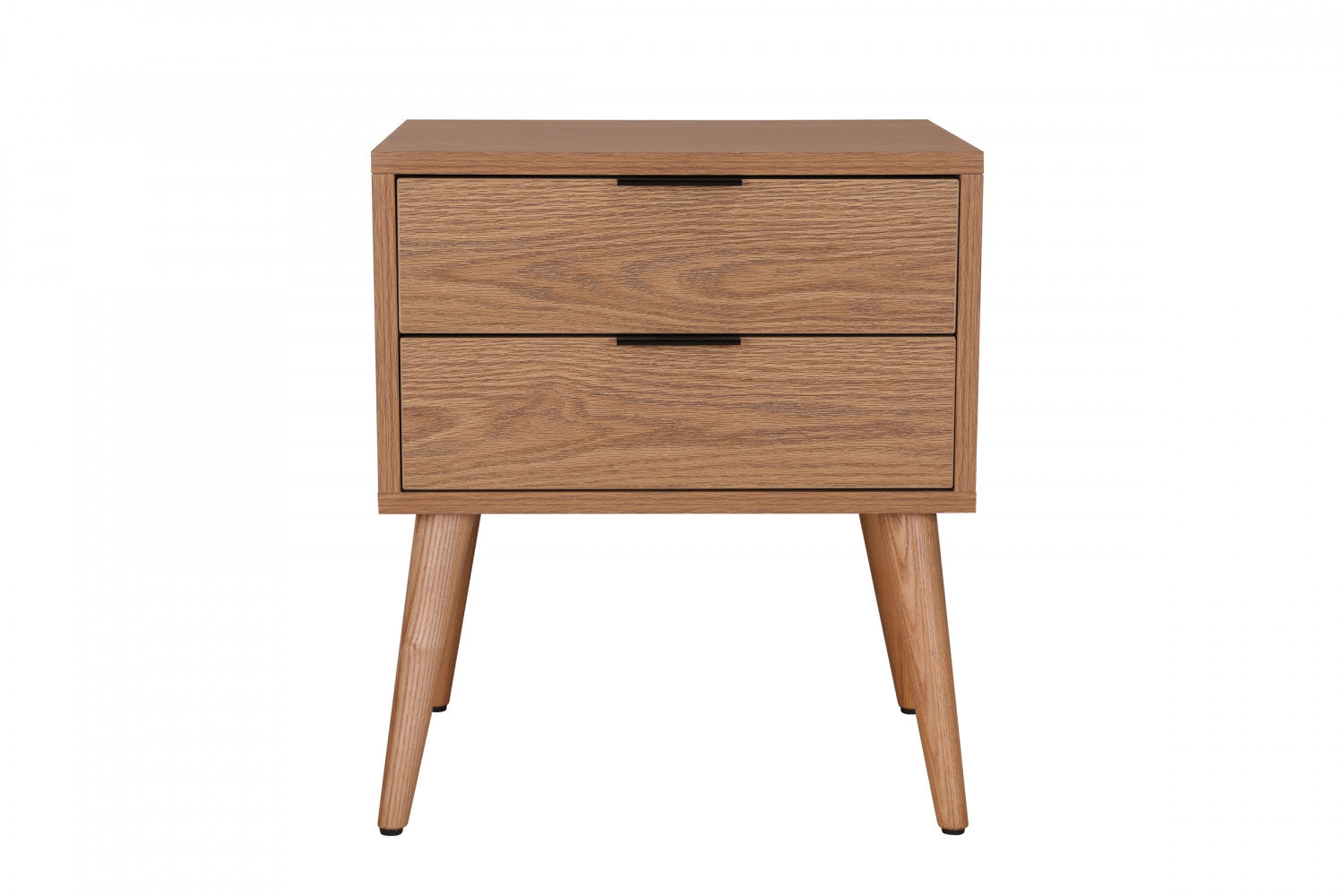 The Flashby Collection gives you the building blocks to create your best bedroom ever thanks to a contemporary design and sturdy construction. This nightstand’s compact profile is perfect for modest-sized bedrooms and pays homage to Mid-Century Modern design with its use of clean, geometric lines atop exposed angled metal legs. A faux natural wood finish with a realistic wood grain pattern adds a distinct sense of character. Minimalist edge pull hardware in a dark grey metal tone contributes to the modern look by allowing easy access to both drawers without obstructing the look of their façades. Durably constructed with solid wood, engineered wood, and plywood, the Flashby is here to keep your items safe and look good while doing so.