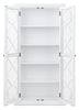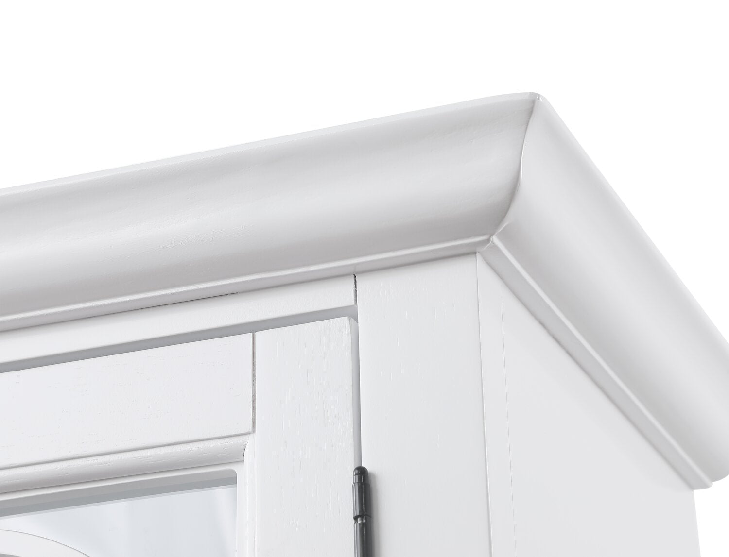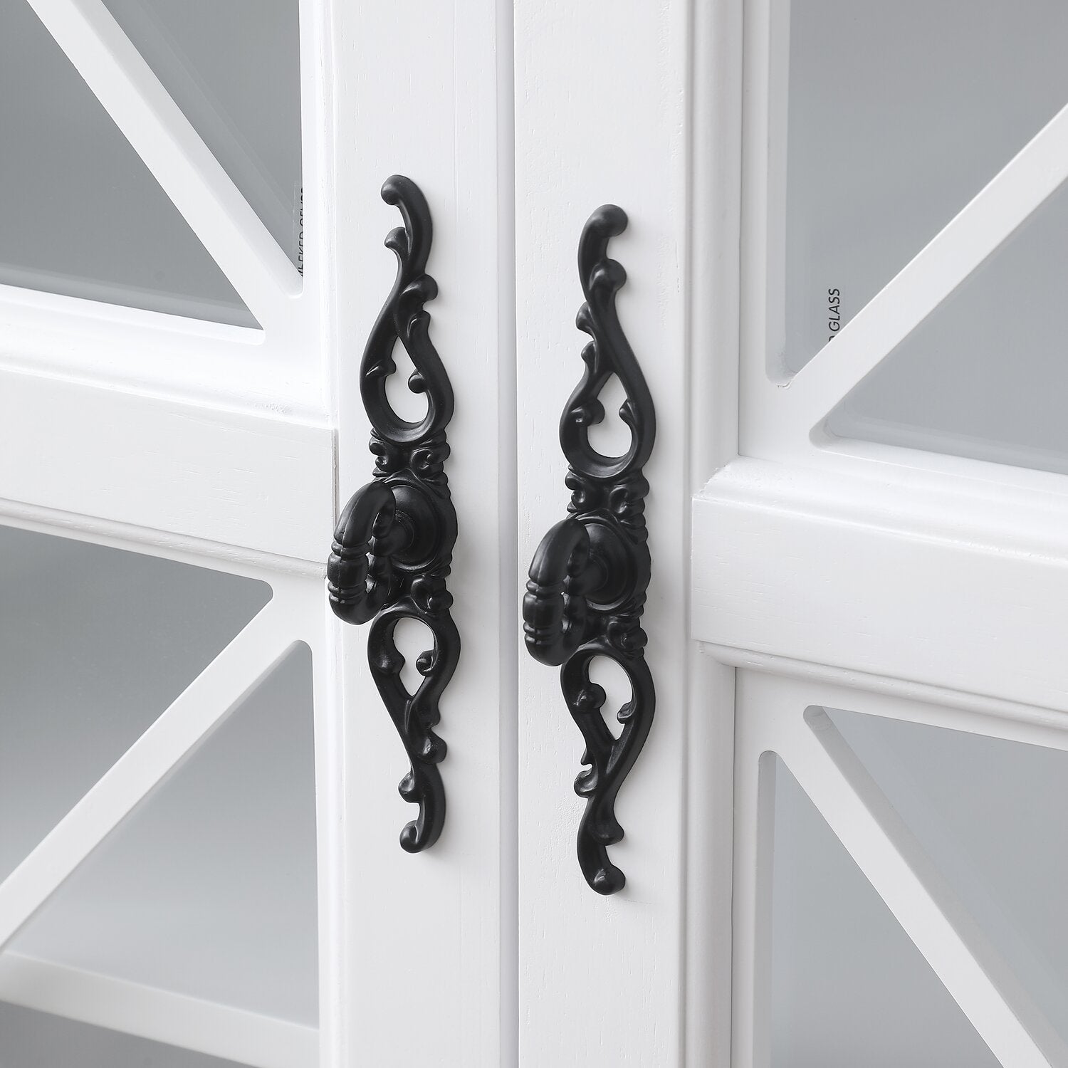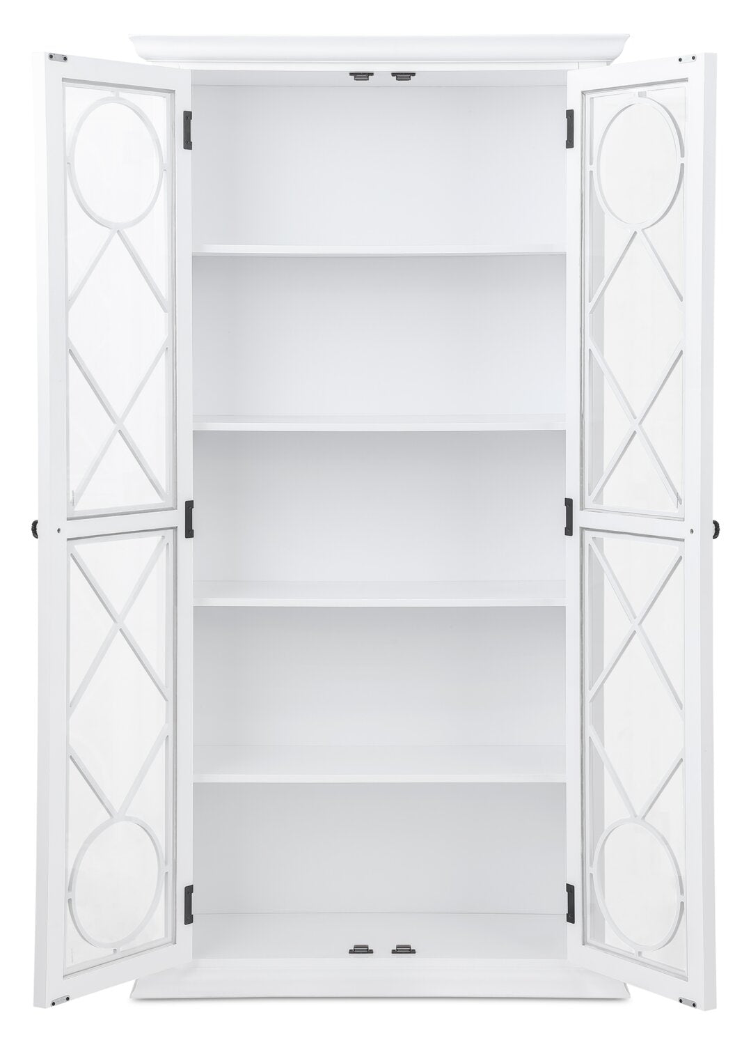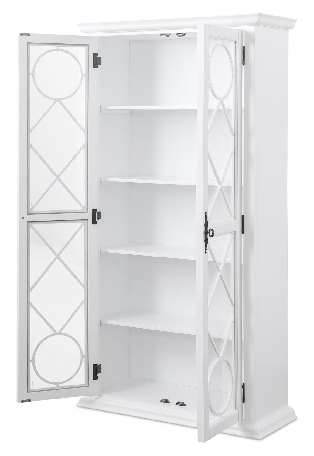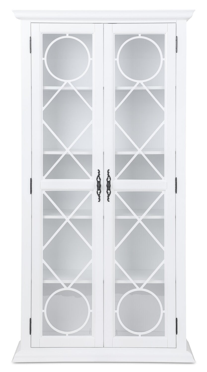 Turn everyday storage into an elegant display with the Frances curio cabinet. Behind tempered glass doors, four shelves provide the perfect space to showcase fine china, treasured collectibles or stylish decor. Decorative mullion fretwork on the glass doors beautifully highlights your curated pieces, while a fresh white finish with black metal hardware adds timeless appeal. With its blend of charm and versatility, the Frances curio cabinet complements a wide range of home decor styles and will be a stunning addition to your home.