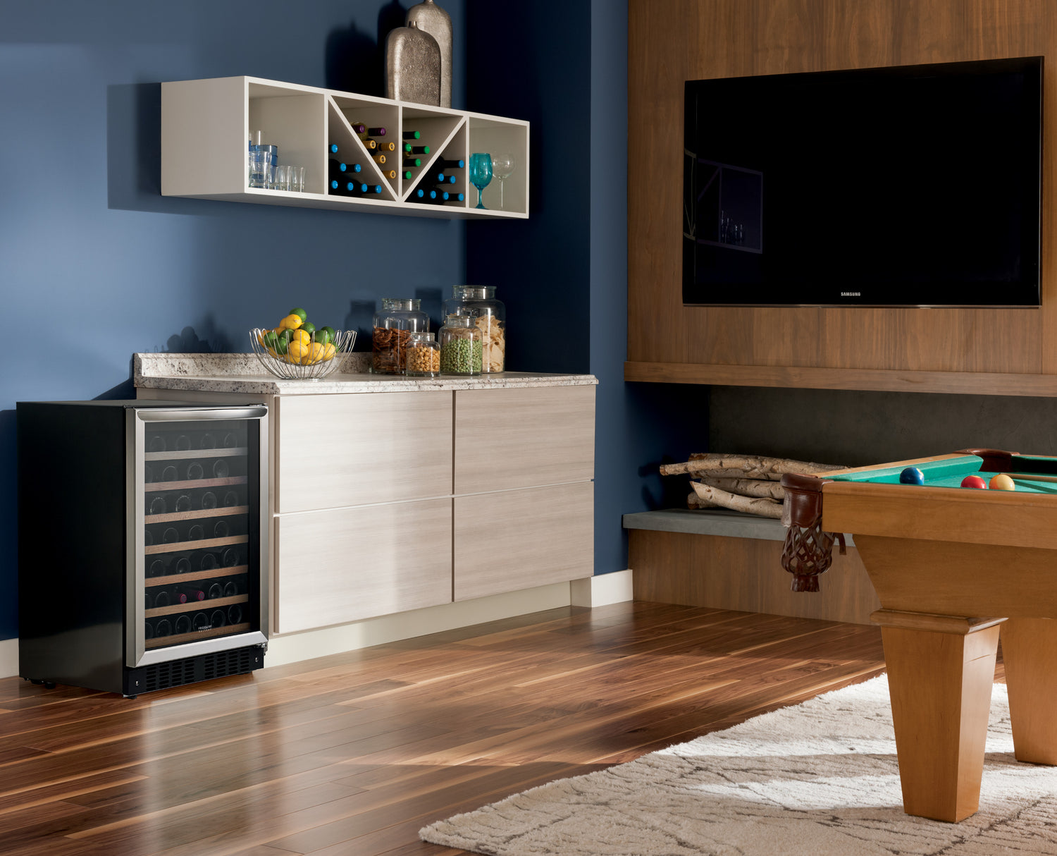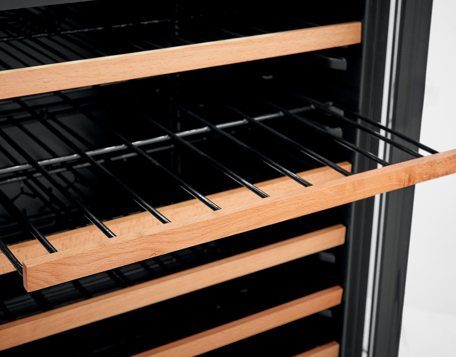 52-Bottle Capacity: Electronic Temperature Control: Wood-Trimmed Wire Racks: LED Interior lighting: Flexible Installation Options: Tinted Glass Door with Stainless Steel Frame: |