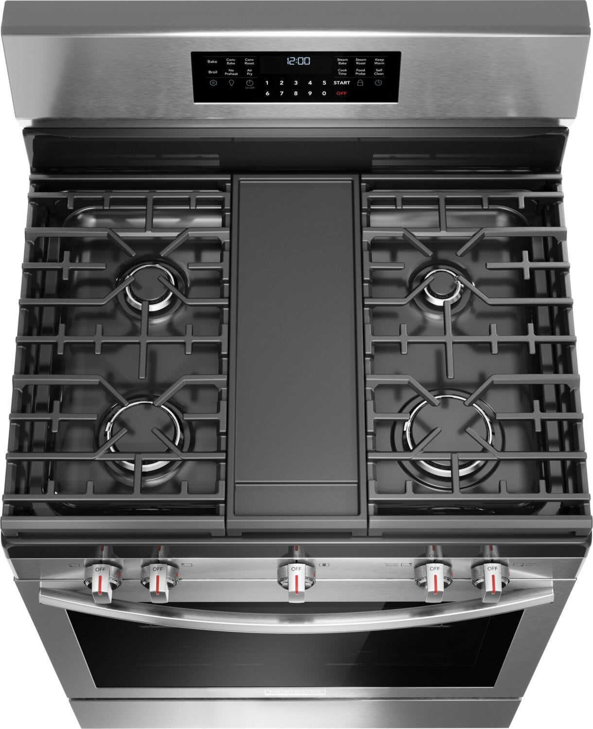 Total Convection: No Preheat: Air Fry: Five Burner Cooktop with Integrated Griddle: Slow Cook: Temperature Probe: Two Cleaning Options: |