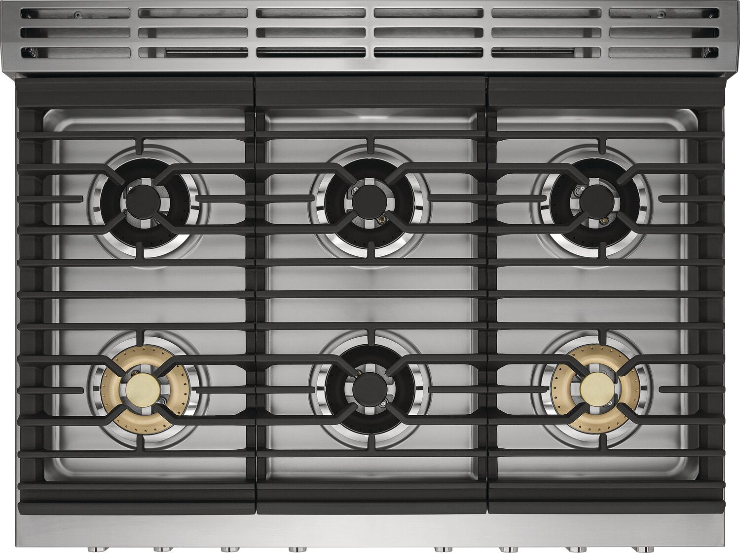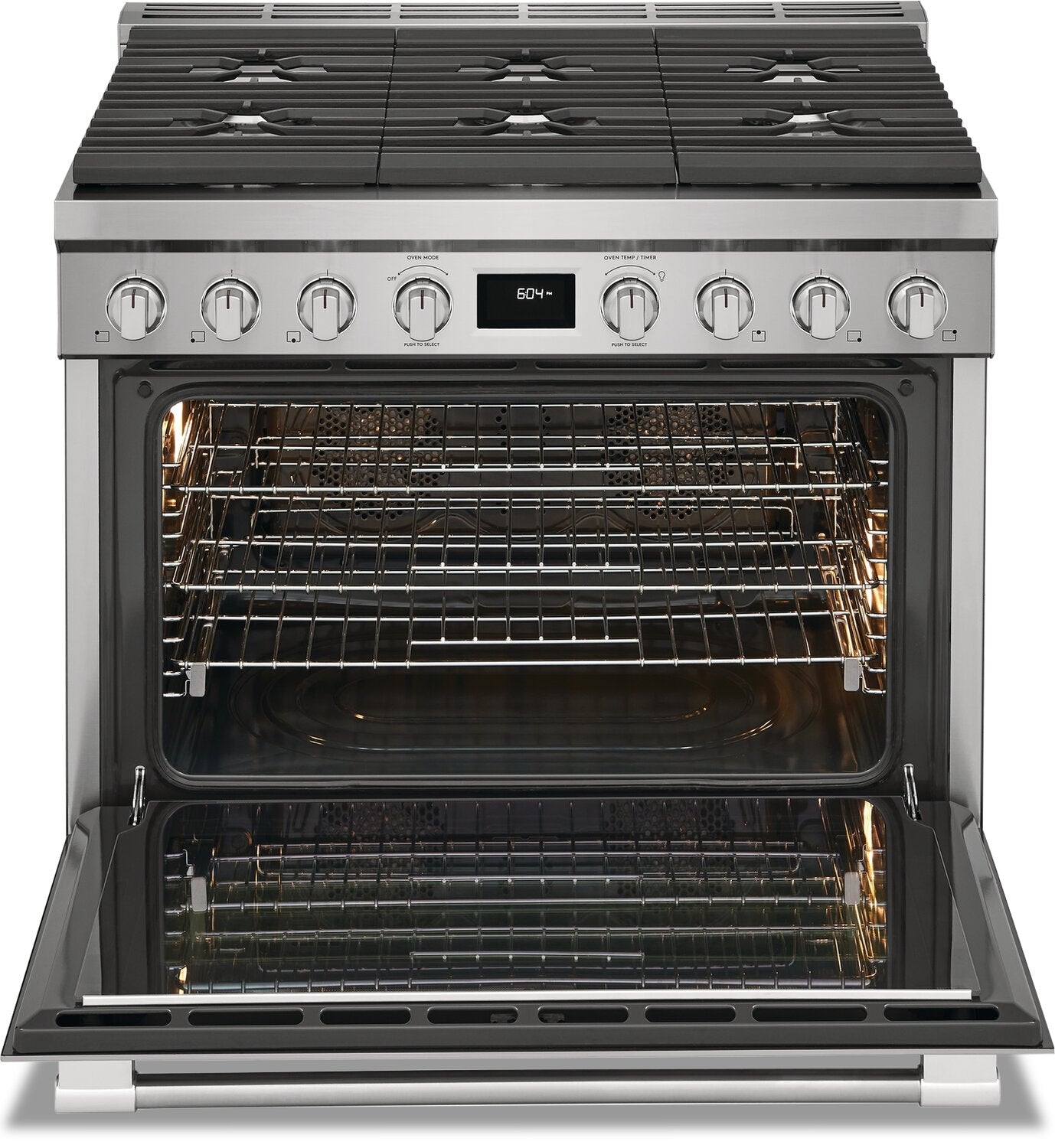 Flexible Six-Burner Cooktop: Best of Both Worlds with Dual Fuel: Continuous Grates: Dual Fan Convection: No More Guessing: One Hour Steam Clean: |
