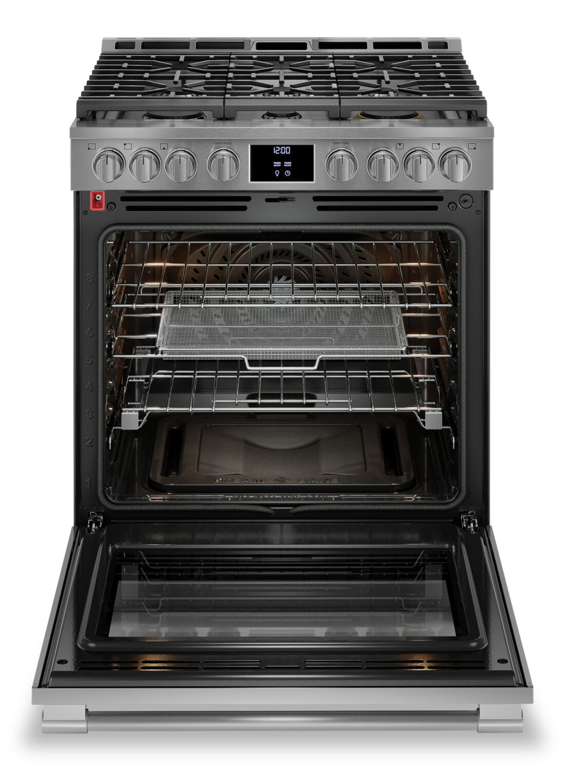 Total Convection: No Preheat: Air Fry: Six Burner Cooktop: Slow Cook: Temperature Probe: Steam Bake: Two Cleaning Options: |