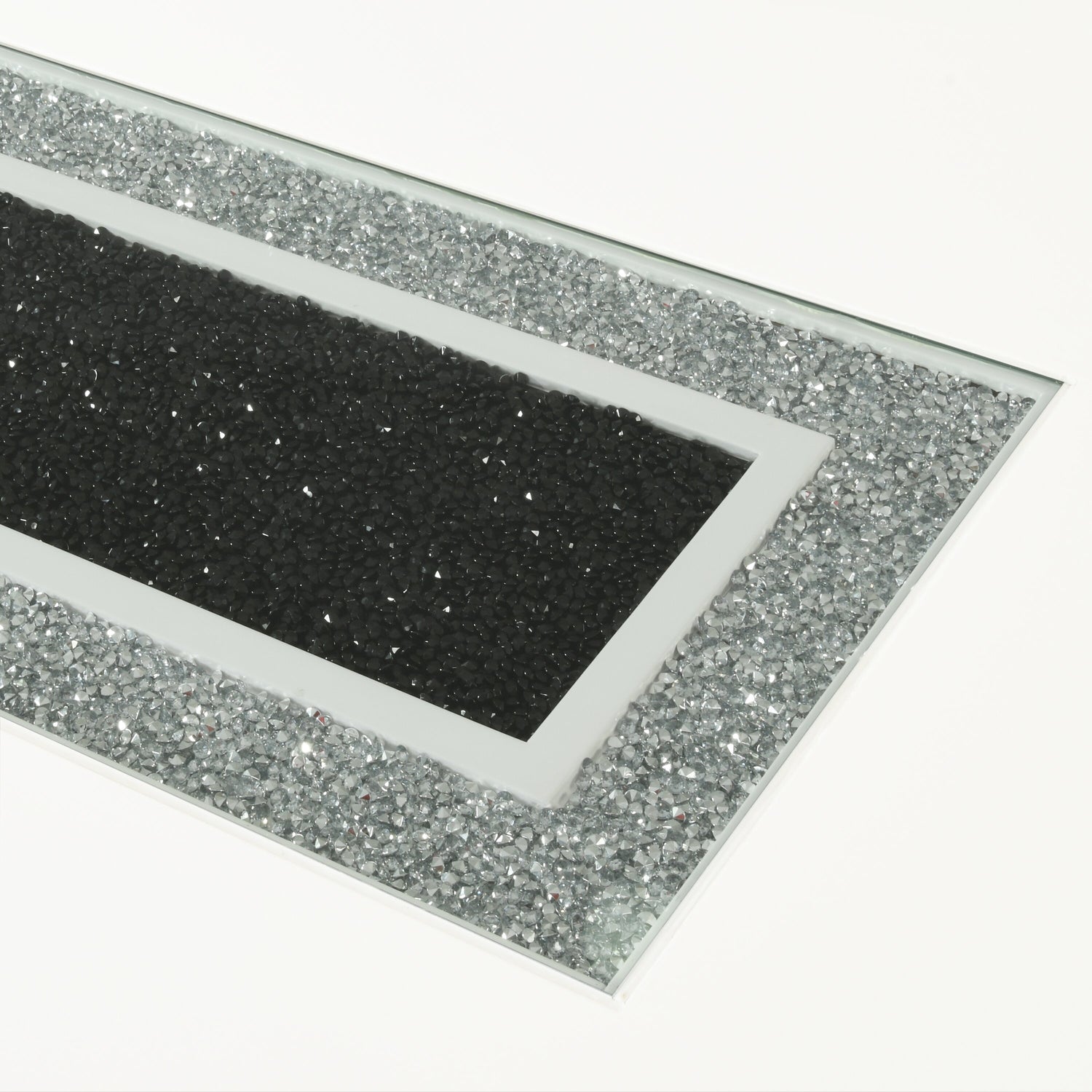 Dazzle your dinner guests with the sparkle of this Garbo dining table. Bands of sparkling silver wrap around the glossy white base for a subtle yet glitzy look to elevate this piece. A glass insert protects the glittering black and silver beads sitting in the centre to charm your company. A minimalist design allows the accent colours to shine without distracting from the modern details. Let style and elegance join you for a meal at this Garbo table.